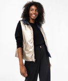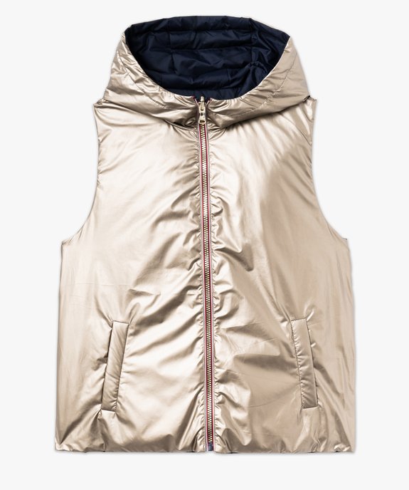 Laissez-vous séduire par l'originalité de ce blouson sans manches à capuche. Ce blouson femme au matelassage léger se porte en toute saison, sa capuche est ajustable grâce à un cordon coulissant. Spécialement conçue pour les adeptes de mode, cette doudoune sans manches offre un coloris intemporel d'un côté et un coloris métallisé de l'autre, vous permettant de changer de style en un clin d'œil ! Cette doudoune réversible apporte une touche distinctive à toutes les tenues tout en procurant une douce chaleur. Dotée d'une fermeture zippée et de deux poches raglan avec zip d'un côté et boutons pression de l'autre, elle allie praticité et élégance. Un incontournable pour une allure stylée en toutes circonstances.