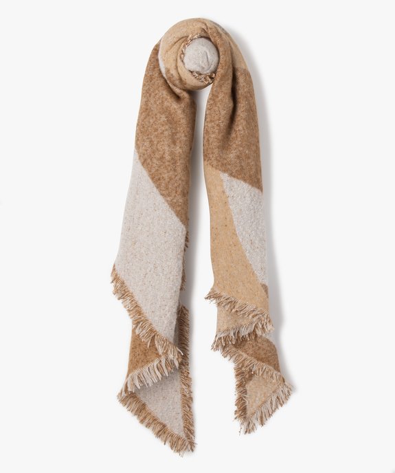 De la douceur, de la chaleur et beaucoup de confort, voici ce que vous garantit cette écharpe femme. Une écharpe en maille idéale pour vous couvrir cette saison tout en conservant un maximum de style. On aime sa maille ultra douce, ses bords frangés, ses extrémités en biais et ses motifs graphiques. Une écharpe à franges à porter avec une veste de tailleur comme avec un manteau.