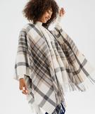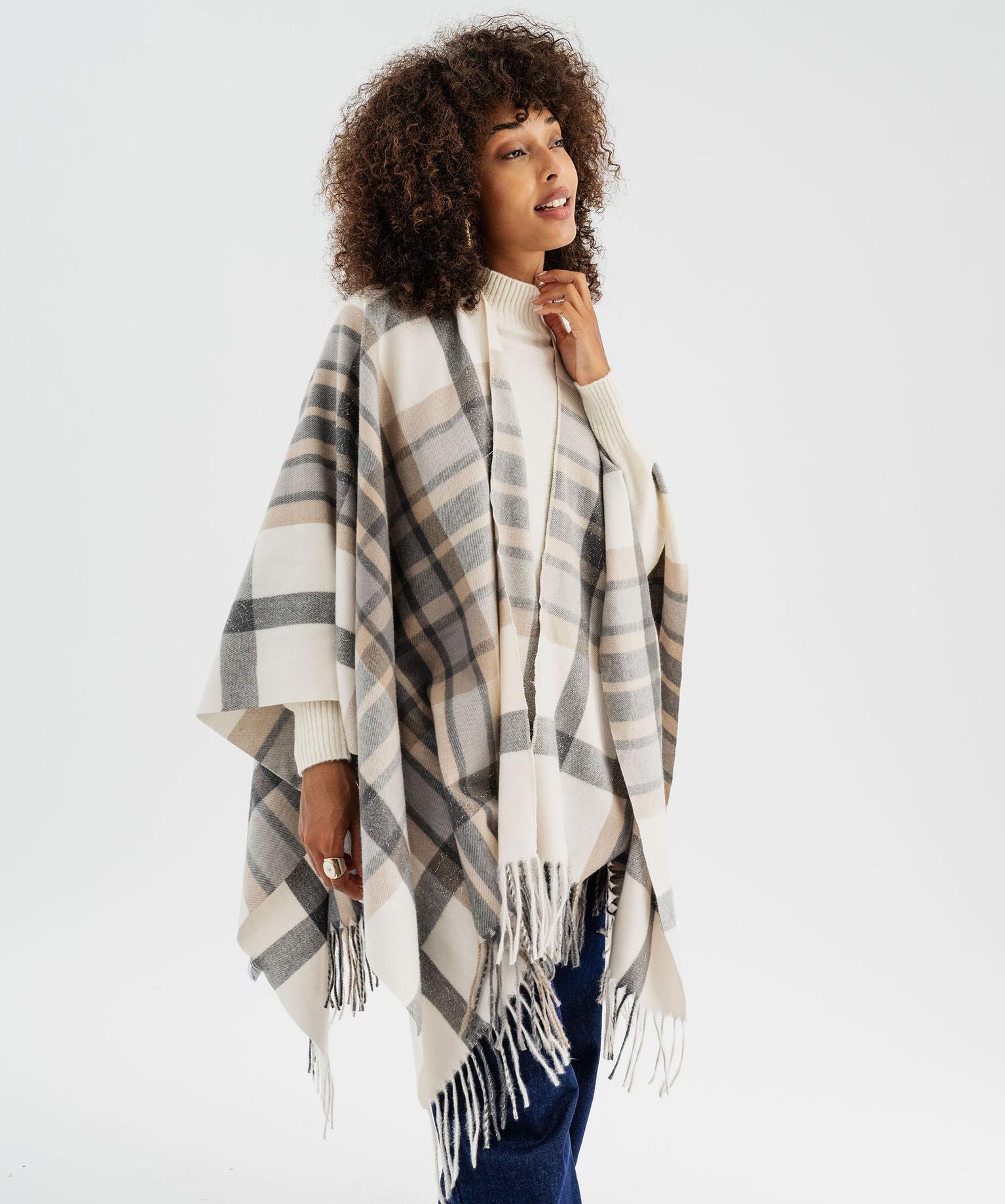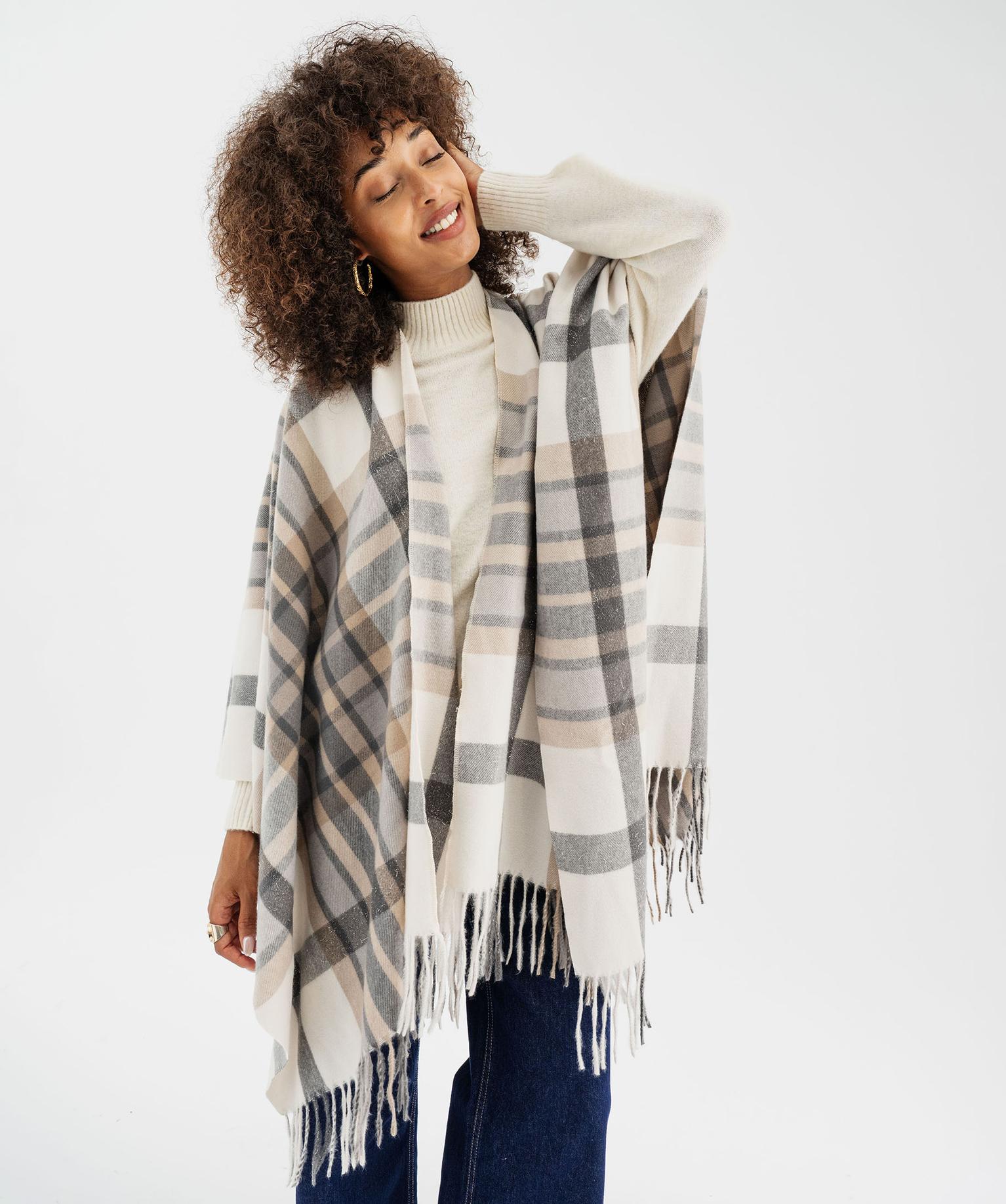 Echarpe poncho à carreaux avec fil métallisé femme beige