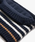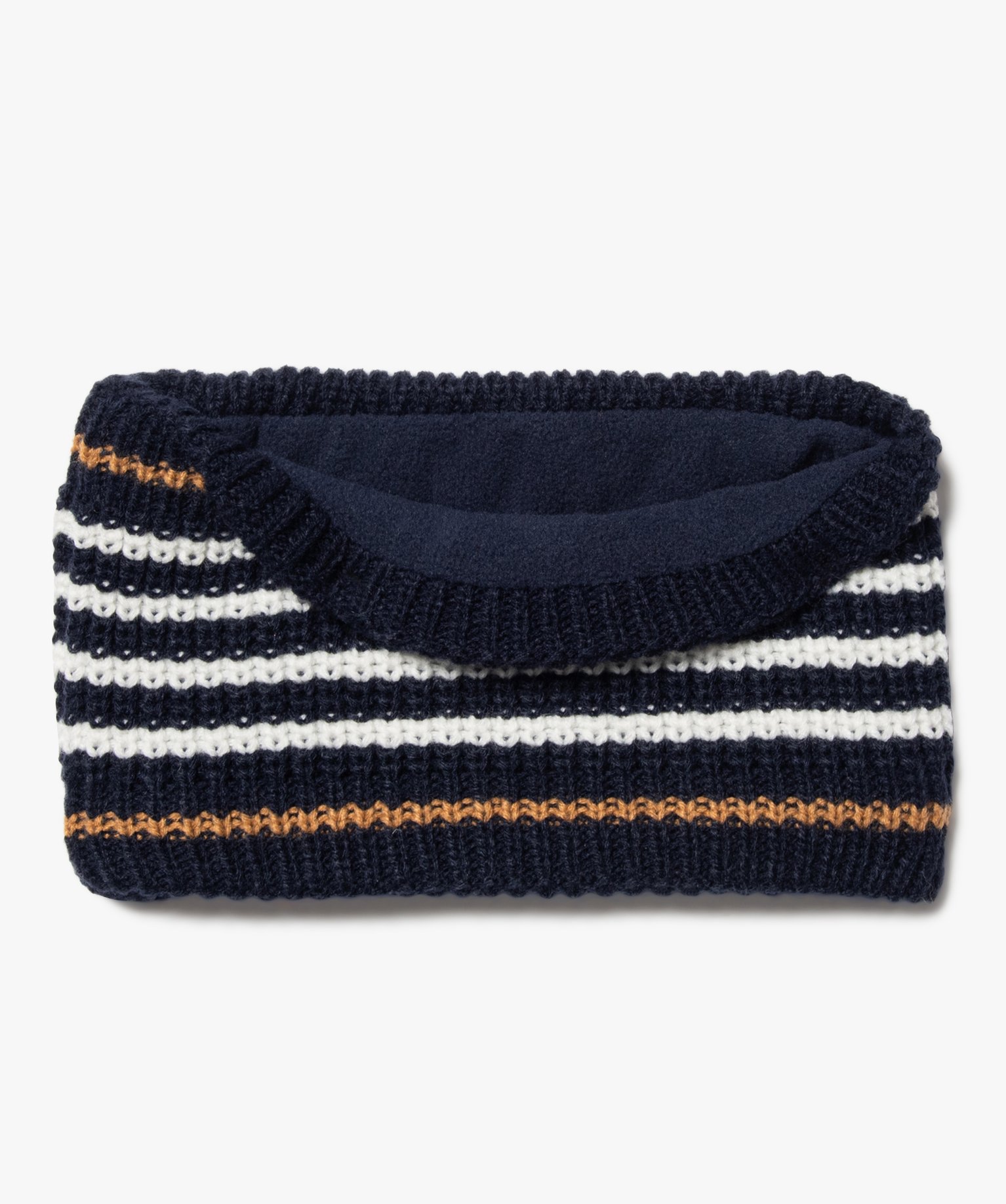 Cette jolie écharpe snood offrira aux tout-petits une douce chaleur réconfortante cet hiver. Une écharpe bébé facile à enfiler grâce à sa forme snood et qui reste toujours bien en place. Elle est confectionnée dans une maille rayée d’inspiration marine, agrémentée de liserés contrastants sur les côtés. Ce snood à rayures est entièrement doublé de maille polaire pour offrir aux enfants un confort exceptionnel. Il s’accorde avec les moufles et le bonnet assortis pour donner du style à un manteau uni.