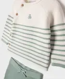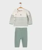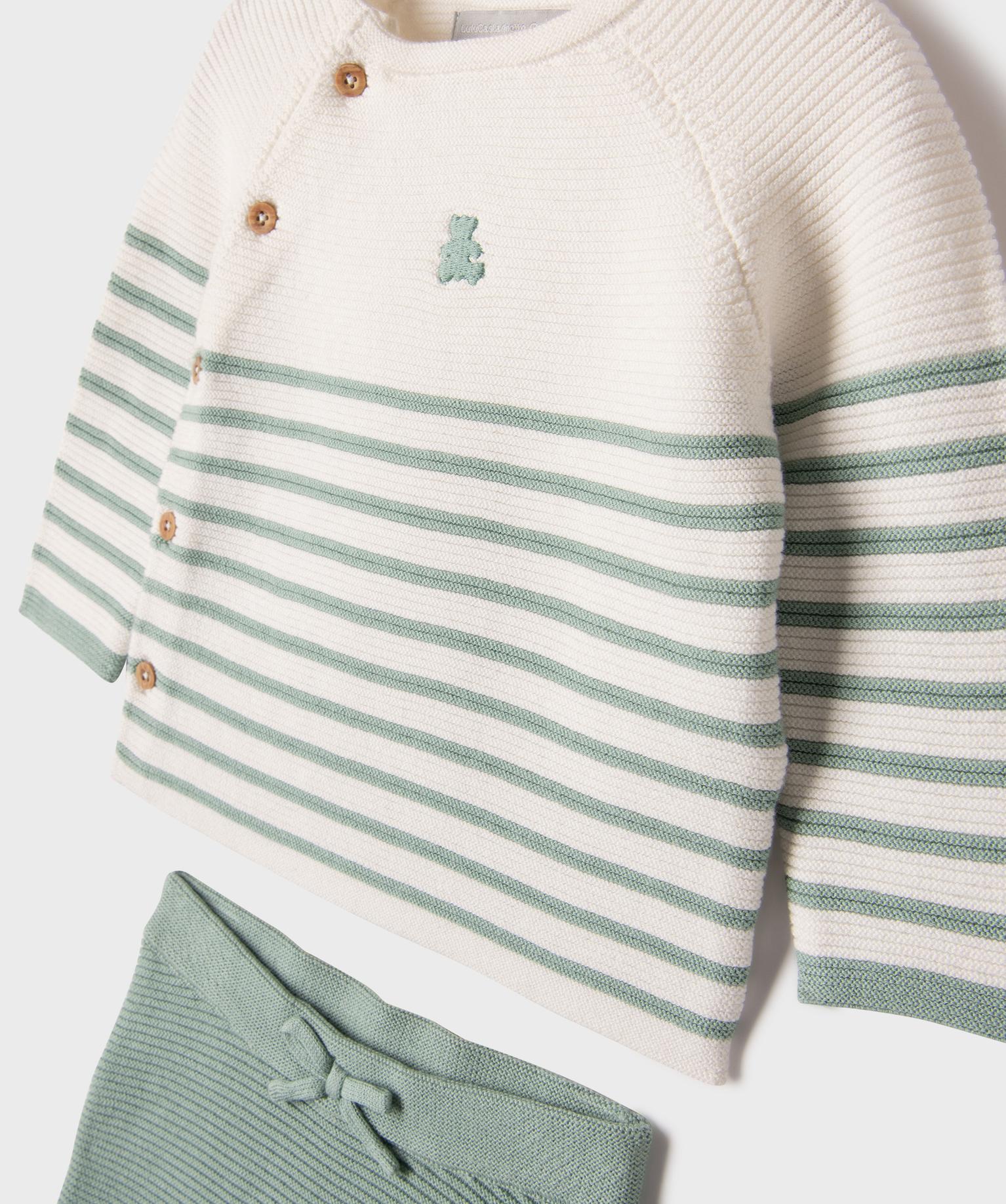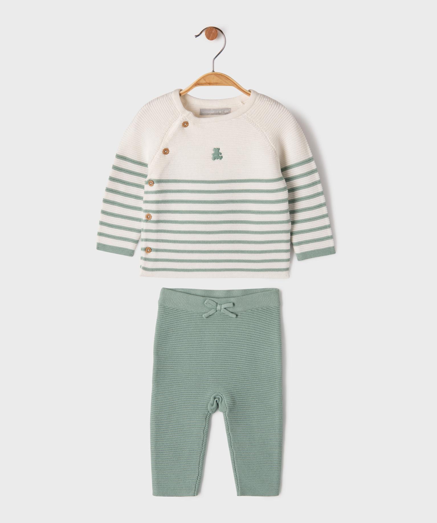 Offrez à votre enfant confort et style avec ce charmant ensemble 2 pièces bébé tricoté dans une maille douce et raffinée 100% coton. Le haut brassière à manches longues, se distingue par ses rayures délicates et sa fermeture pratique sur le côté avec des boutons effet bois. Un adorable ourson brodé sur la poitrine ajoute une touche tendre, signature LuluCastagnette. Le pantalon uni, doté d’une taille élastique pour un confort optimal, est agrémenté d’un petit nœud discret qui complète élégamment l’ensemble. Ce bel ensemble mixte pour bébé allie douceur, confort et style pour habiller les minis au quotidien.