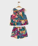 Cet ensemble 2 pièces orné de motifs exotiques mettra de la couleur dans le dressing de votre petite fille. Un ensemble en coton léger conçu pour offrir un maximum de confort aux tout-petits tout au long de l’été. Cet ensemble bébé fille se compose d’une blouse et d’un short. La blouse sans manches est dotée d’un col rond et s’enfile facilement grâce à des boutons sur l’épaule. Elle est agrémentée d’un volant dans le bas ajoutant une délicate touche girly. Le short ample possède une ceinture ajustable par élastique intérieur et deux petits boutons fantaisie sur l’avant. Un ensemble coloré plein de charme à porter avec des sandales.