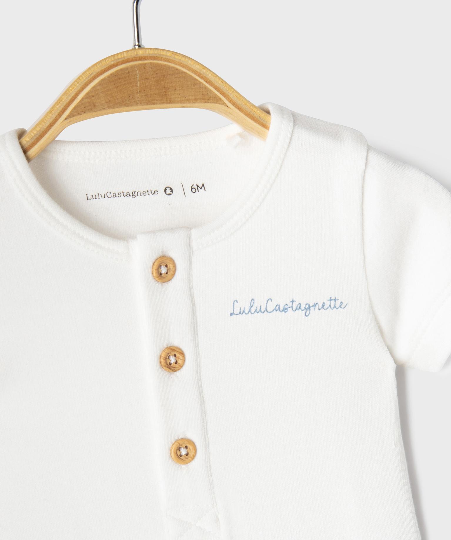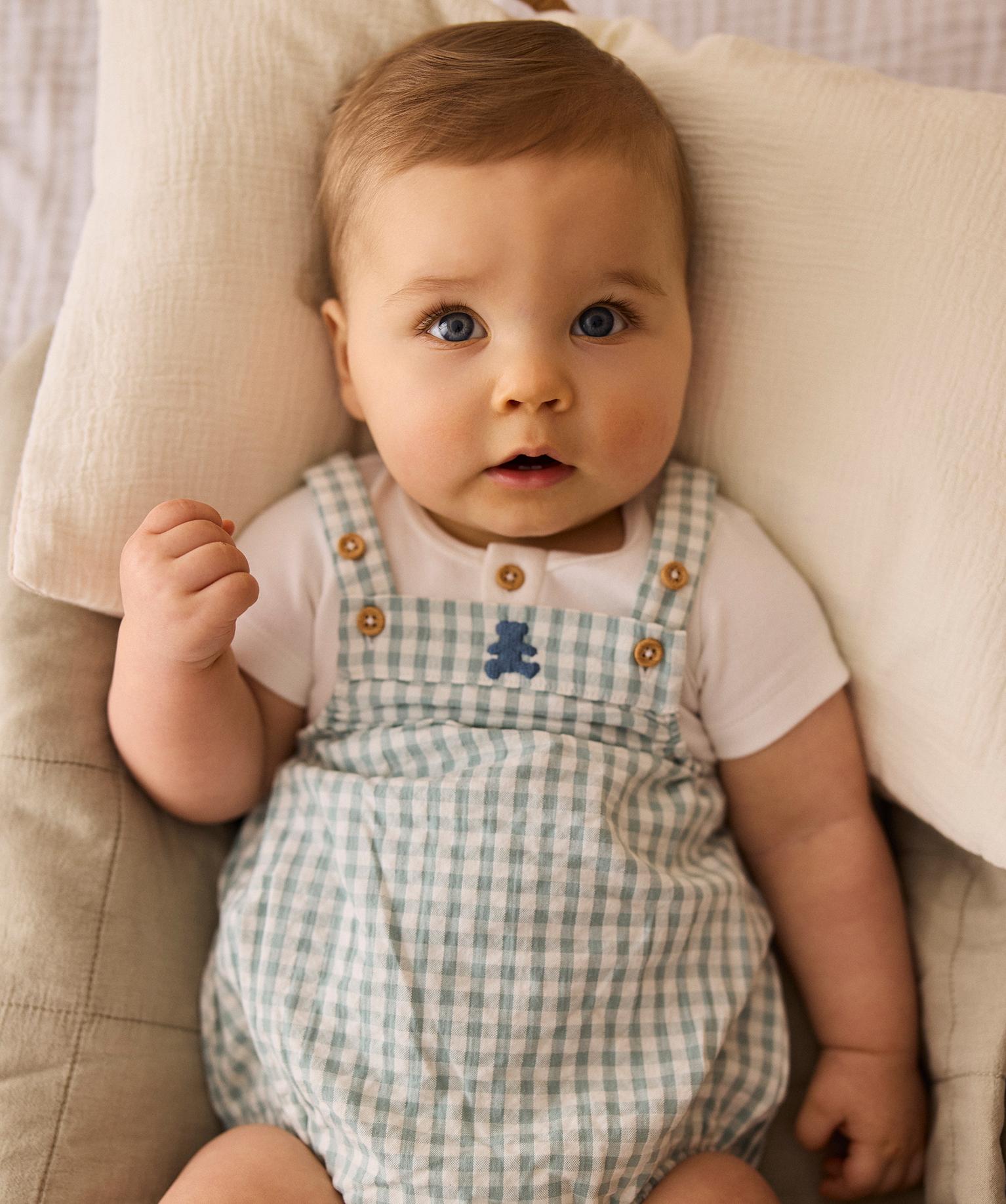 Cet ensemble LuluCastagnette est parfait pour accompagner bébé lors des premiers mois. Un ensemble 2 pièces bébé garçon composé d’un body et d’une jolie barboteuse à carreaux. Le body à manches courtes en coton enveloppe les bouts de chou de douceur, et se distingue par son encolure ronde dotée de 3 petits boutons aspect bois et la signature de la marque sur la poitrine. La barboteuse est confectionnée en coton gaufré, elle possède des finitions élastiques aux emmanchures et aux cuisses et des bretelles ajustables sur 2 positions. Son motif vichy intemporel est rehaussé d’un petit ourson brodé sur la poitrine. Un ensemble bébé plein de charme, idéal pour les beaux jours.