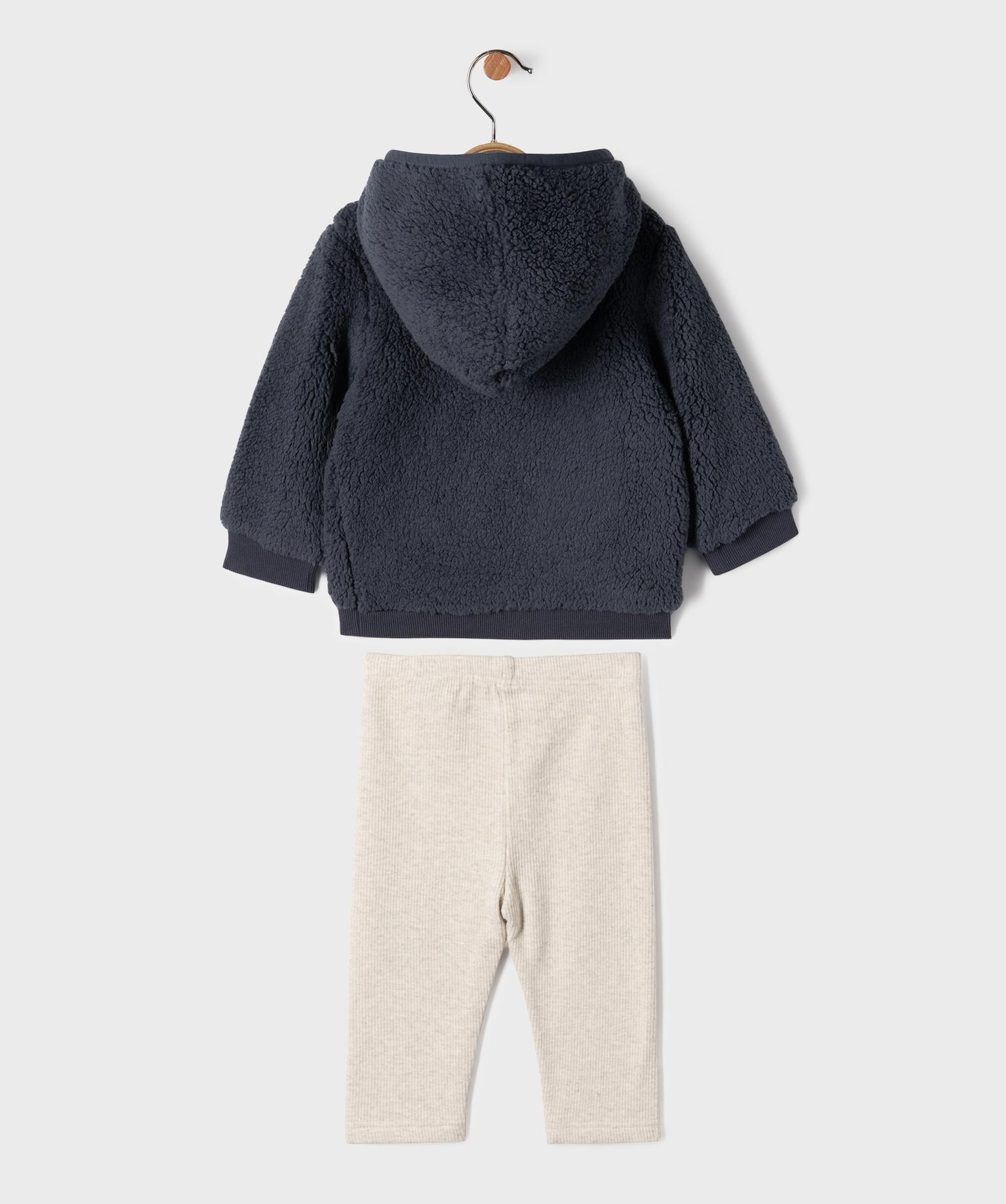 Cet ensemble 2 pièces pour bébé garçon constitue une tenue à la fois confortable et chaude pour accompagner les bouts de chou tout au long de la saison hivernale. Il se compose d’un sweat à capuche en maille sherpa avec col zippé, agrémenté d’une poche à rabat en toile et d’un legging chiné en maille côtelée. Un ensemble douillet à porter avec des boots ou des baskets.