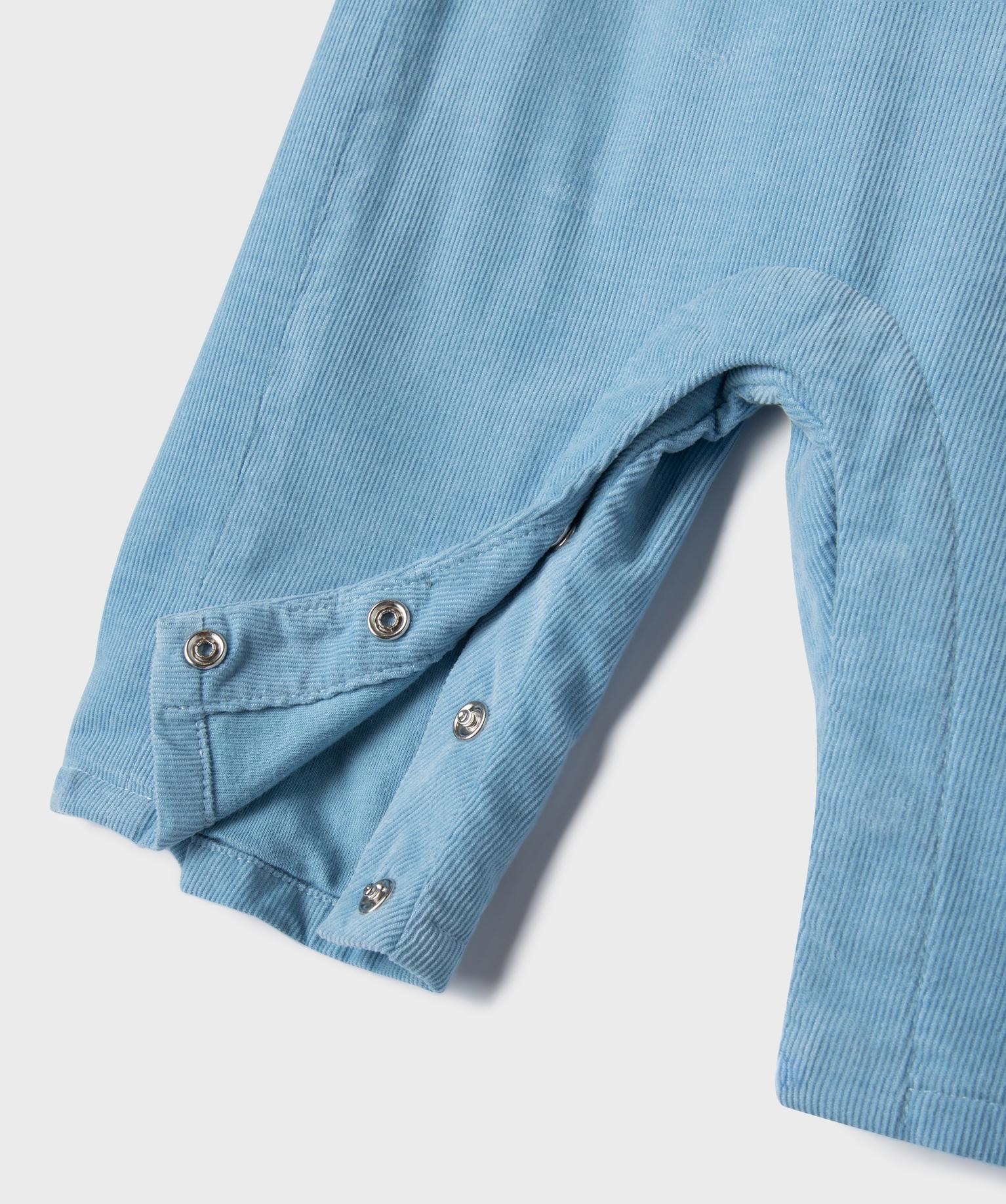 - Une salopette en velours côtelé, doublée jersey, ornée d’un ourson brodé sur le buste et fermée par des boutons aspect bois et des pression à l'entrejambe.