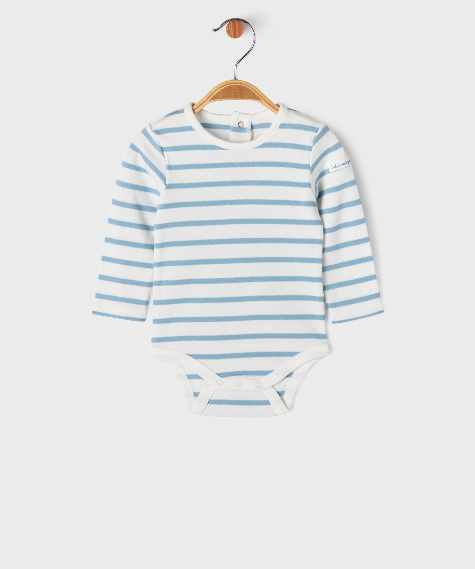 - Un body à manches longues en coton orné de rayures et fermé par des boutons pression dans le haut du dos et à l’entrejambe.
