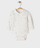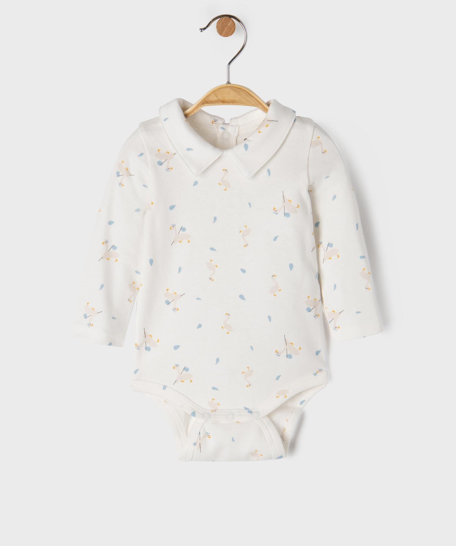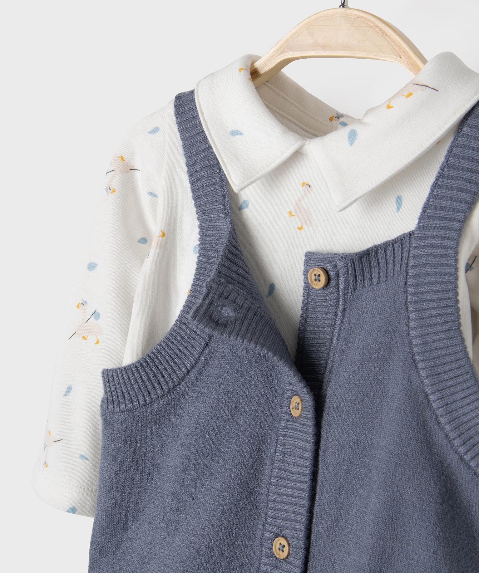 Un ensemble bébé 2 pièces plein de douceur pour le quotidien. Il se compose d'un body et d'une salopette. Le body manches longues, orné d’un col chemise, se ferme par boutons-pression au dos et à l’entrejambe pour un habillage simple. Il est totalement décoré d'un imprimé oies plein de tendresse. La salopette en maille, enrichie de viscose, offre un toucher moelleux. Les bretelles côtelées et les boutons bois imitation apportent beaucoup de charme à cet ensemble. Un cadeau de naissance idéal !