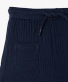 - Un short ample, façon bloomer, avec ceinture élastiquée ajustable par cordon coulissant, 2 petites poches plaquées devant et des revers cousus dans le bas.