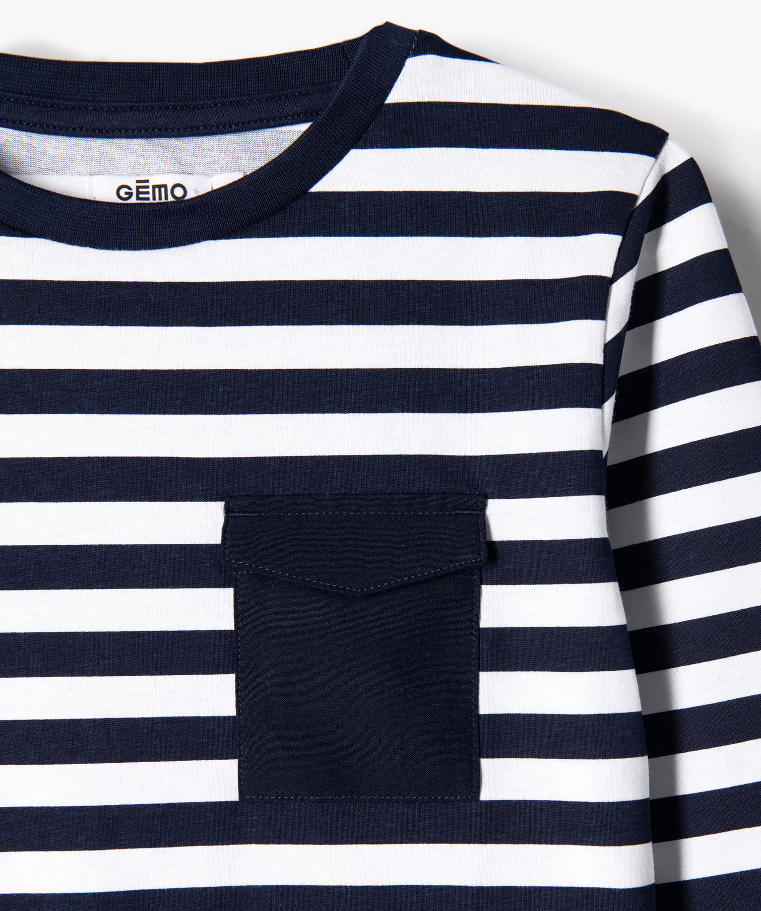 - un tee-shirt manches longues col rond à rayures dans un esprit marinière, avec petite poche poitrine uni, 100% coton.