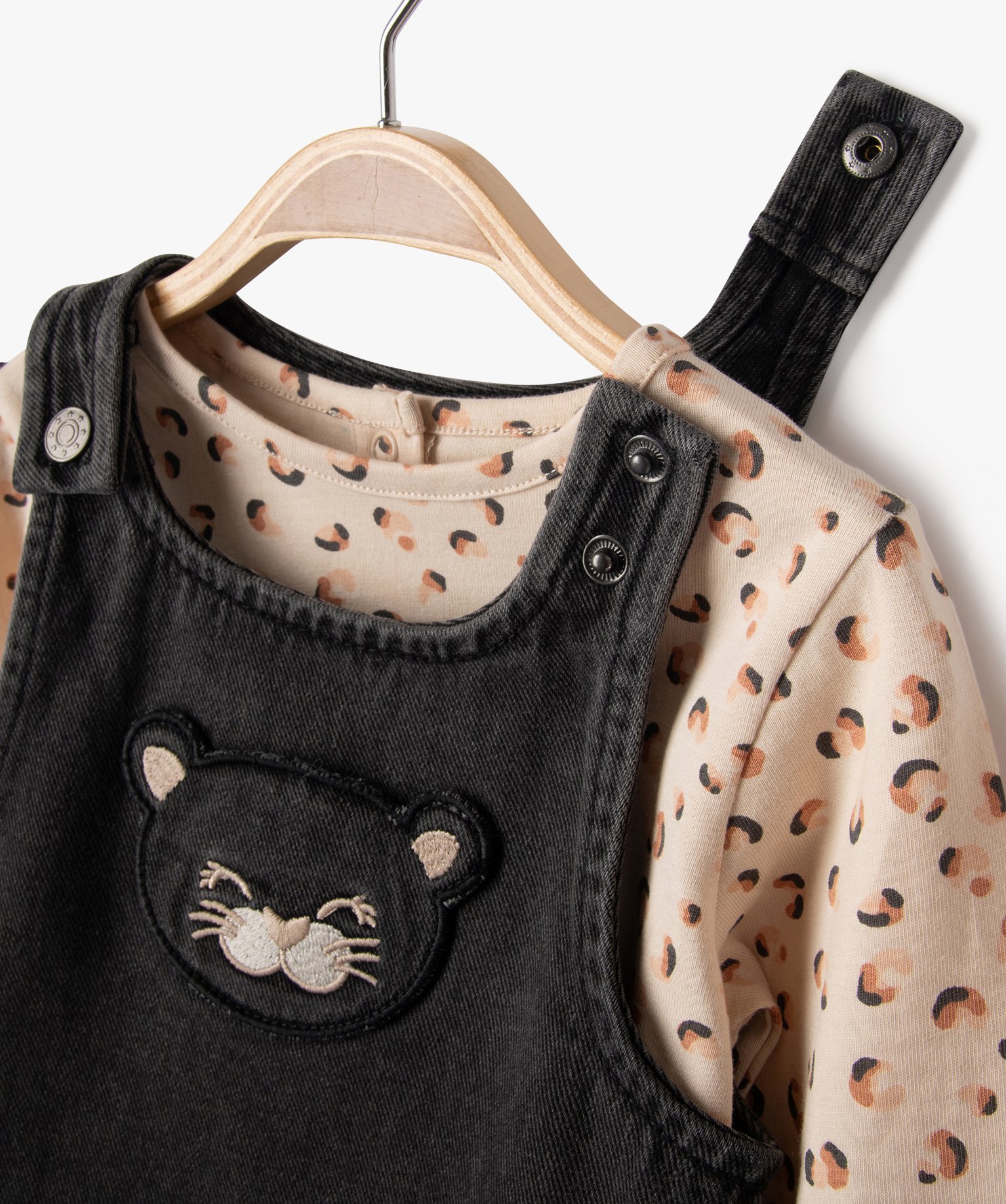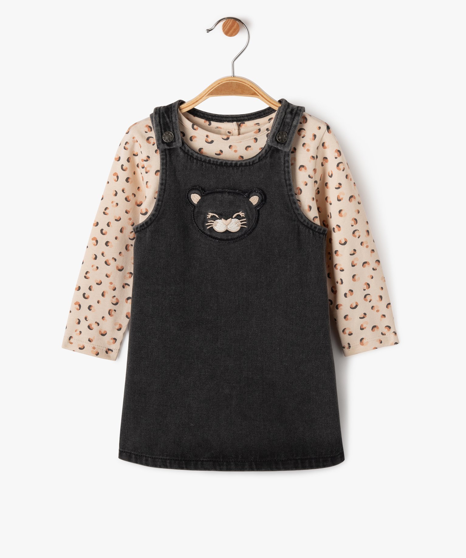 Ce bel ensemble bébé fille apportera une touche animale dans le vestiaire de bébé. Un ensemble 2 pièces composé d’une robe trapèze à bretelles en jean ornée d’une tête de tigre et d’un tee-shirt à manches longues à motif léopard. Un ensemble spécialement imaginé pour les petites aventurières en herbe. Tee-shirt col rond fermé par boutons pression dans le haut du dos. Robe avec bretelles ajustables.