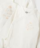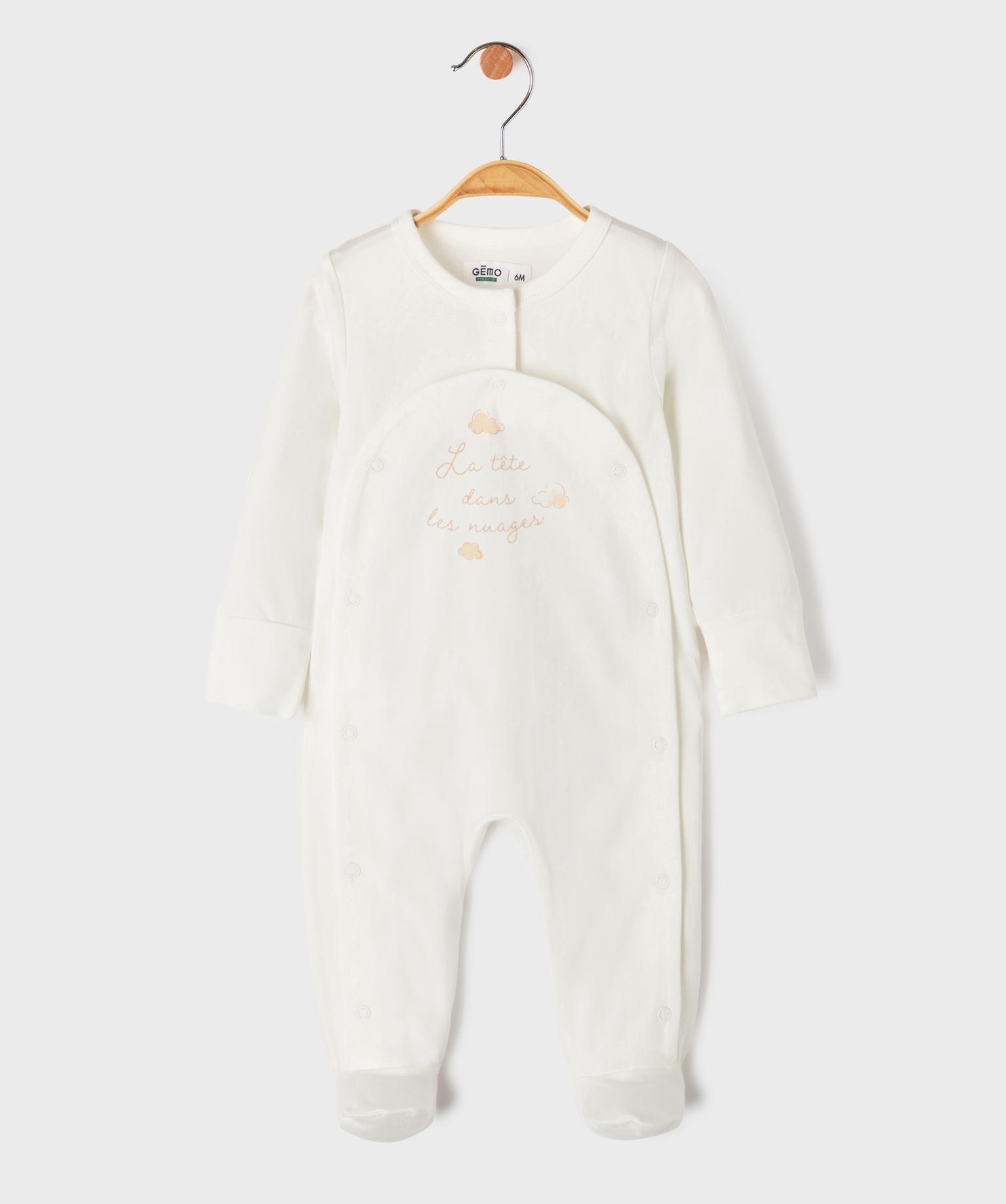 Cet ensemble naissance sur le thème des nuages enveloppe bébé de douceur. Il comprend un pyjama dors-bien à ouverture devant avec moufles intégrées, un body manches longues avec ouverture devant par bouton-pression et un bavoir assorti à fermeture pressionnée sur le côté du cou. Confectionné dans un jersey de coton doux, souple et imprimé, cet ensemble bébé assure un confort parfait pour les premières semaines. Une idée de cadeau utile et pleine de charme.