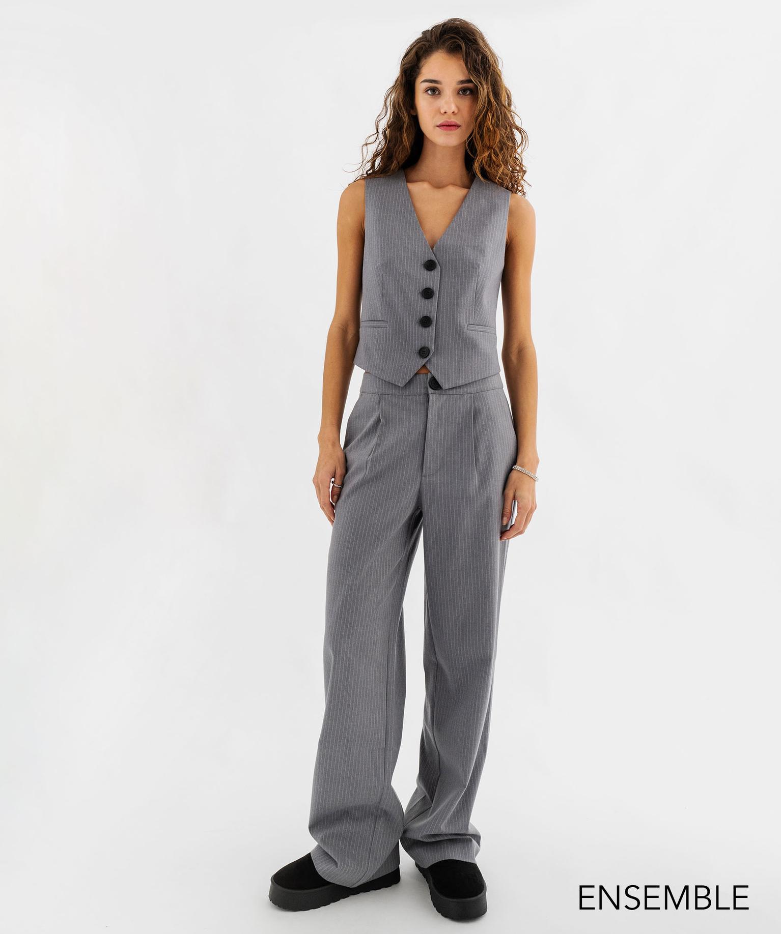 Adoptez un style sophistiqué avec notre ensemble gilet de costume sans manches et pantalon large à taille haute à rayures gris. Élégant et moderne, cet ensemble structuré est parfait pour un look chic et affirmé.