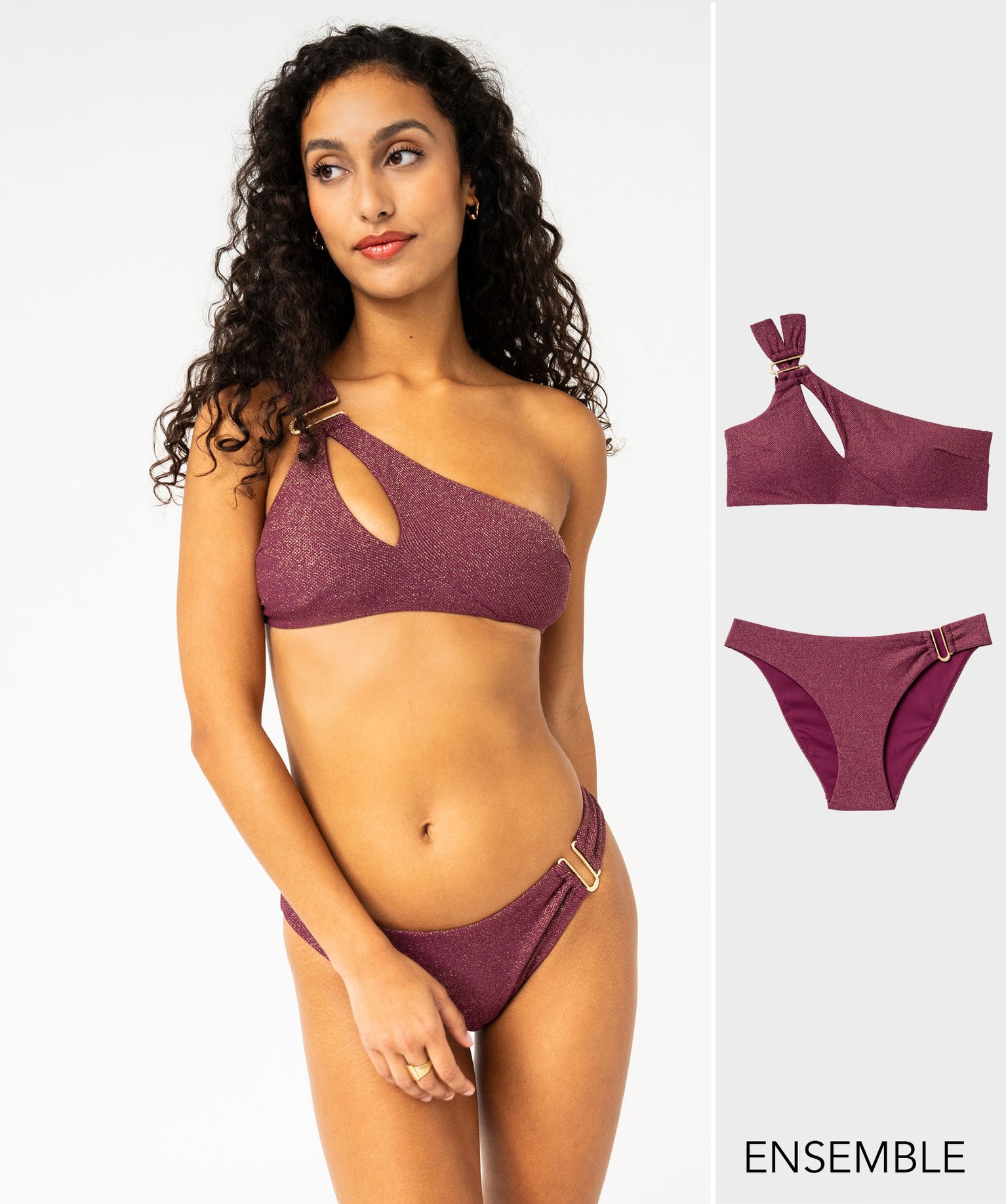 Mettez en valeur votre style avec notre maillot deux pièces violet pour femme, orné d'une boucle métallique fantaisie. Son design raffiné et sa coupe flatteuse en font un choix élégant pour l'été. Confortable et tendance, il vous assure une allure remarquable à la plage ou à la piscine.