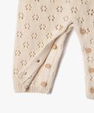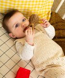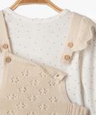 - 1 salopette en fil de coton crocheté, souple et douillet, avec entrejambe boutonné et bretelles réglables sur 2 positions.