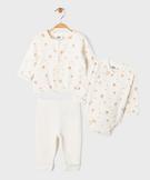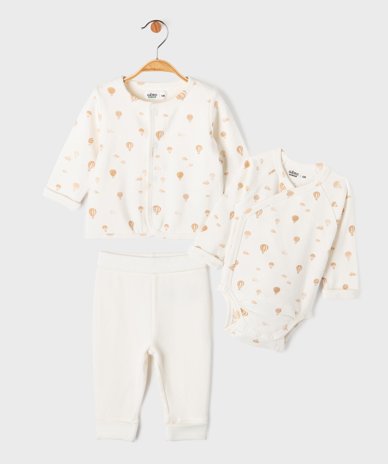 Cet ensemble évolutif accompagnera bébé lors de ses premiers mois. Un lot de 3 pièces indispensables du trousseau confectionnées dans un coton épais de grande qualité et décorées de jolis petits motifs aux couleurs tendres. Cet ensemble bébé mixte se compose de : - Un body à manches longues à fermeture devant,