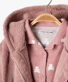 - une robe de chambre en maille peluche douillette avec motif ourson ton sur ton, col châle, ceinture à nouer impossible à égarer, capuche animée d'oreilles d'ourson, 2 poches plaquées et une broderie placée sur la poitrine.