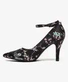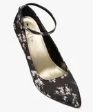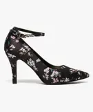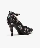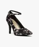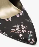 Cet escarpin se pare d’un motif fleuri japonisant sur son ensemble. Sa forme classique, avec bout pointu et talon fin de 9 cm, est twistée à la cheville par une bride réglable, pour bien maintenir le pied. La cambrure assure une silhouette galbée et féminine.
