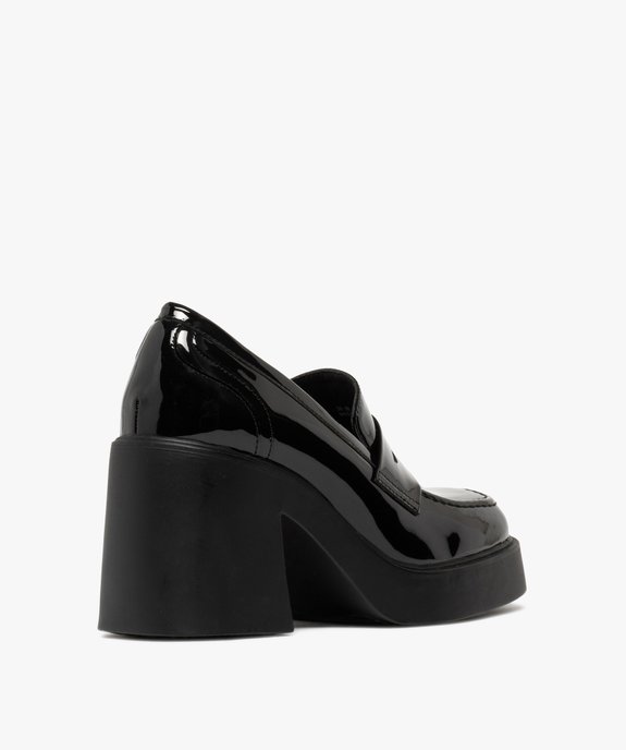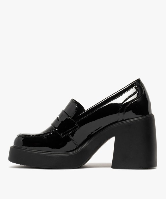Inspirés des mocassins, ces escarpins pour femme optent pour une épaisse semelle plateforme débordante. La tendance bout carré est ici sublimée par le dessus vernis Penny Loafer. Ce modèle d'escarpins à talon haut et flare a définitivement tout pour sublimer et apporter du style à vos tenues : jean, jupes ou robes et ensembles tailleur. Semelle intérieure moussée