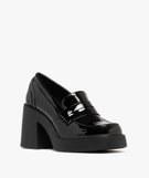 Inspirés des mocassins, ces escarpins pour femme optent pour une épaisse semelle plateforme débordante. La tendance bout carré est ici sublimée par le dessus vernis Penny Loafer. Ce modèle d'escarpins à talon haut et flare a définitivement tout pour sublimer et apporter du style à vos tenues : jean, jupes ou robes et ensembles tailleur. Semelle intérieure moussée