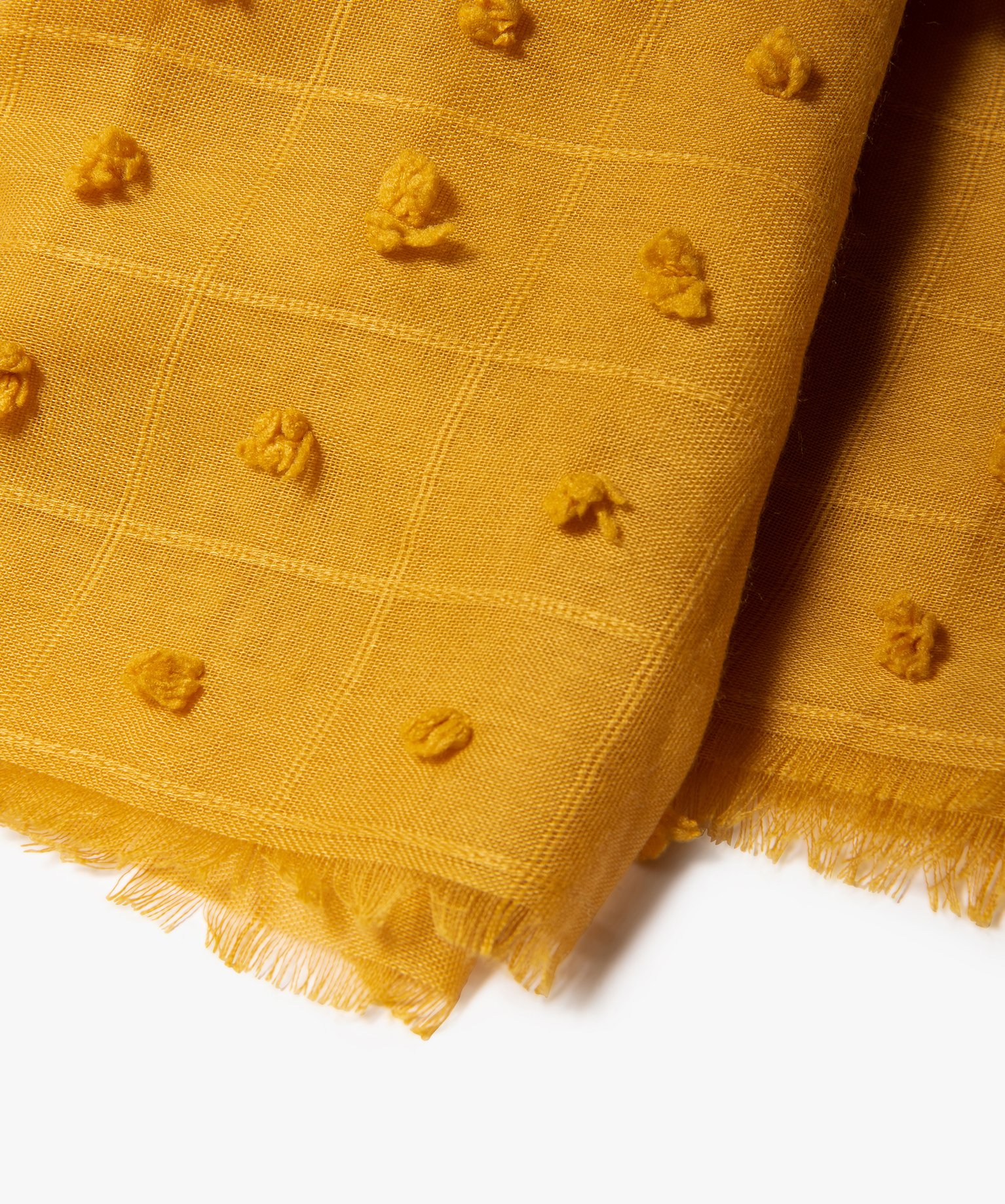 Foulard femme à carreaux avec petits pompons jaune fonce