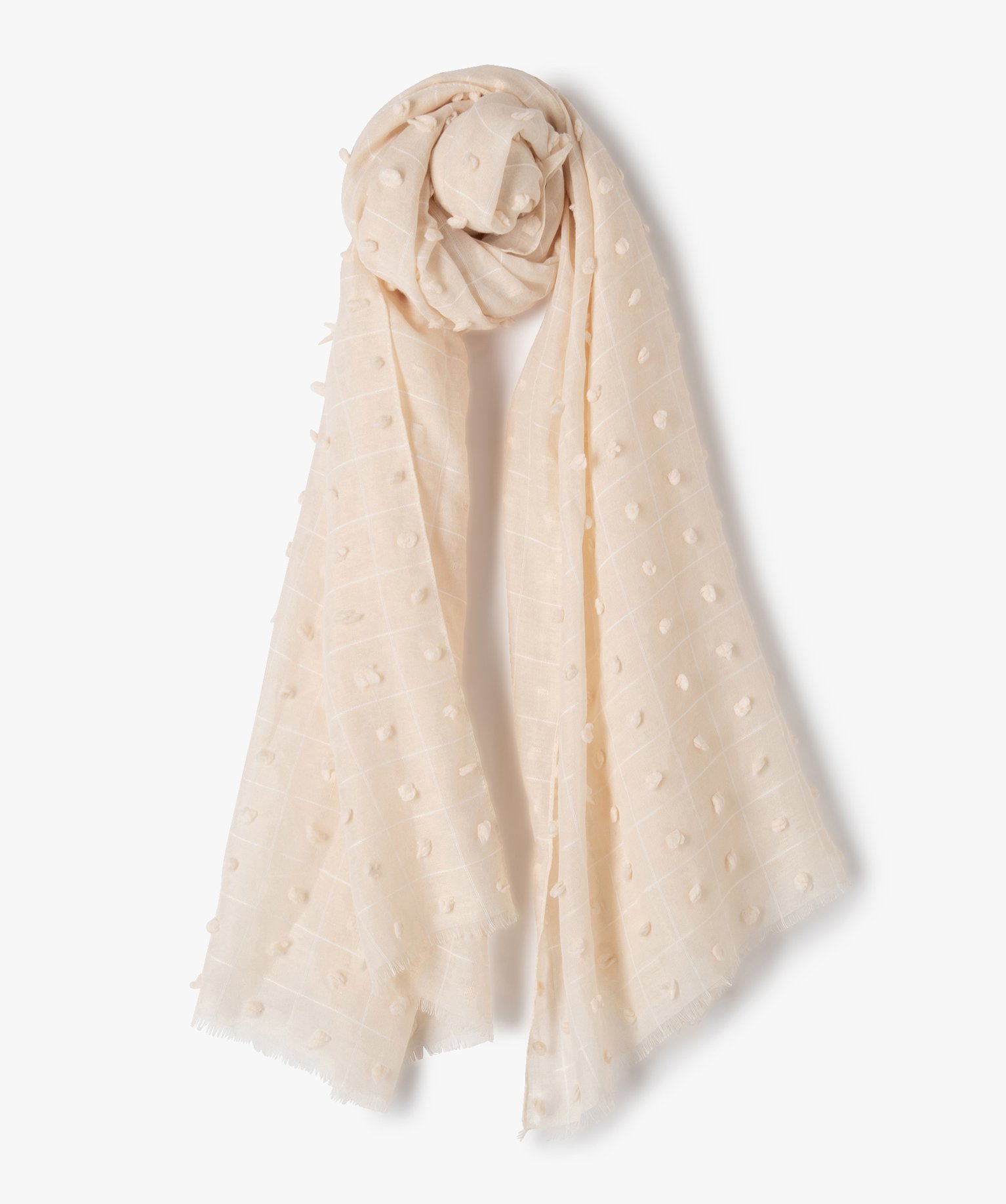 Vous allez tomber sous le charme de ce foulard pour femme orné de fines lignes formant des carreaux et de petits pompons. Un foulard uni au look unique qui offre un effet de relief original. Confectionné dans une matière fine et transparente avec finitions franges aux extrémités. Un joli foulard qui se marie aussi bien avec une veste en jean qu’avec une veste de tailleur.