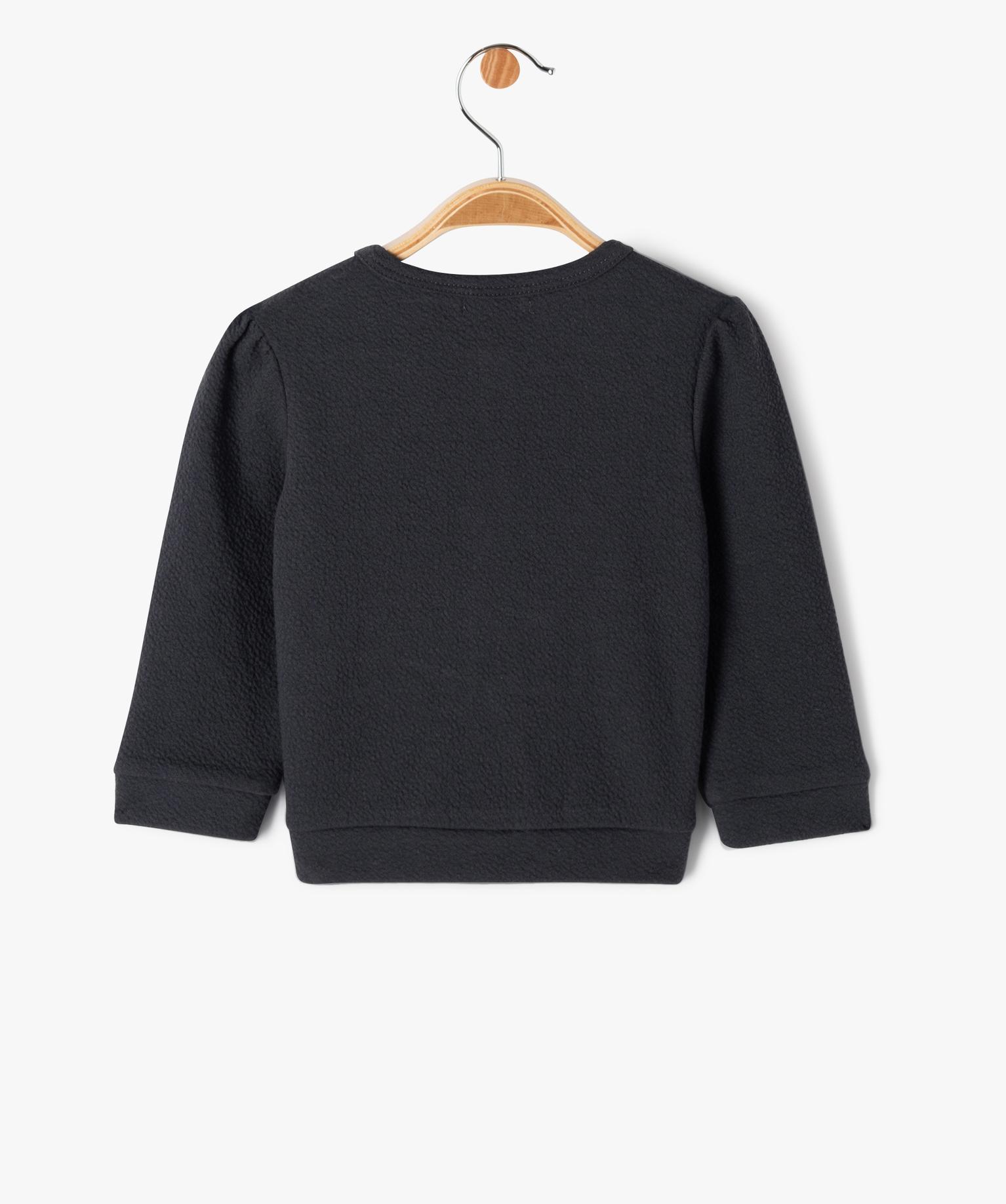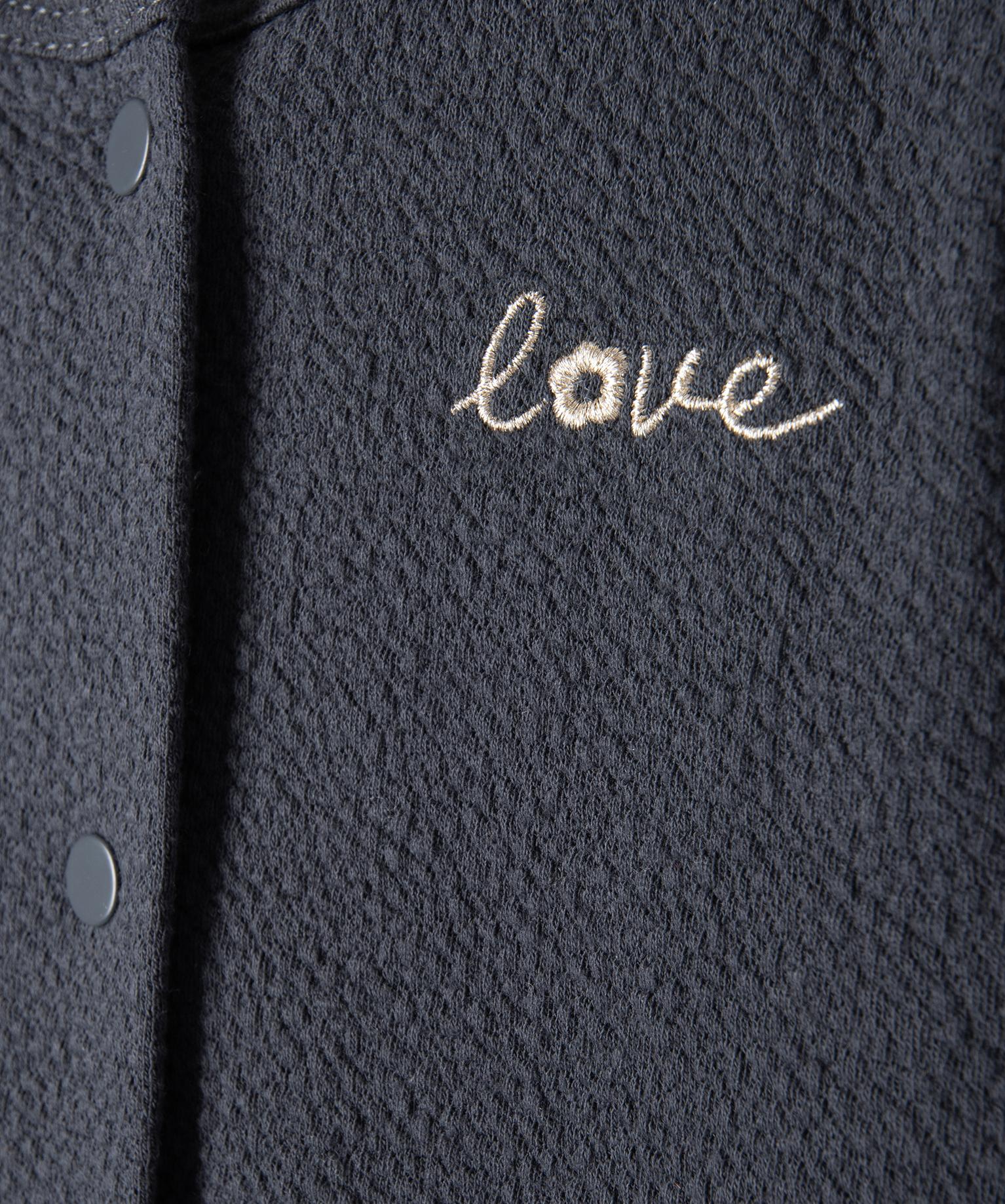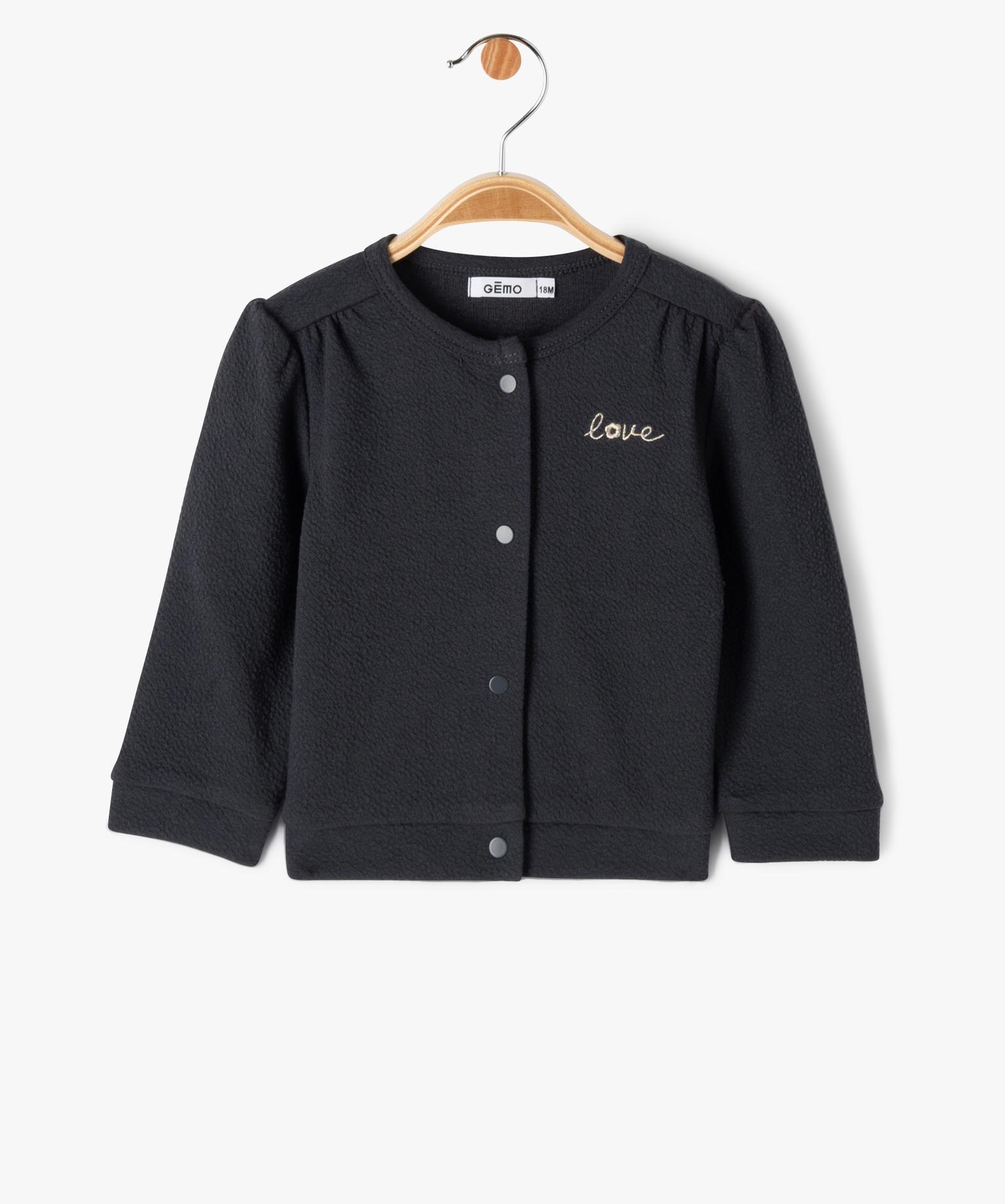 Votre petite fille sera à croquer dans ce gilet en matière texturée ! Un cardigan fermé par boutons -pression aux belles allures de veste, et qui flirte avec le confort du sweat ! Le gilet présente des petites fronces en haut des manches et sur le devant des épaules. Son col rond est souligné d'un biais ton sur ton. Les boutons-pression sont également ton sur ton pour un fini élégant. À porter fermé en guise de pull avec un pantalon ou ouvert comme une veste avec un top girly et une jupe patineuse, par exemple. Broderie au fil doré « Love » sur la poitrine.