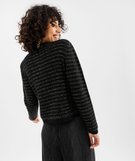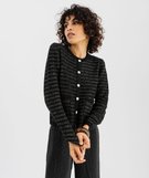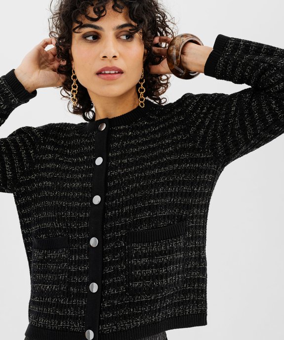 Apportez une touche d'éclat à votre quotidien avec ce magnifique cardigan à rayures scintillantes, parfait pour sublimer toutes vos tenues. Ce gilet femme à col rond, tricoté en maille fantaisie, se distingue par ses élégantes rayures en fil métallisé et ses jolies finitions côtelées au col, aux poignets, dans le bas, ainsi qu'au bord des poches. Les boutons métalliques ajoutent une note de modernité qui rehausse subtilement le côté glamour de ce modèle.