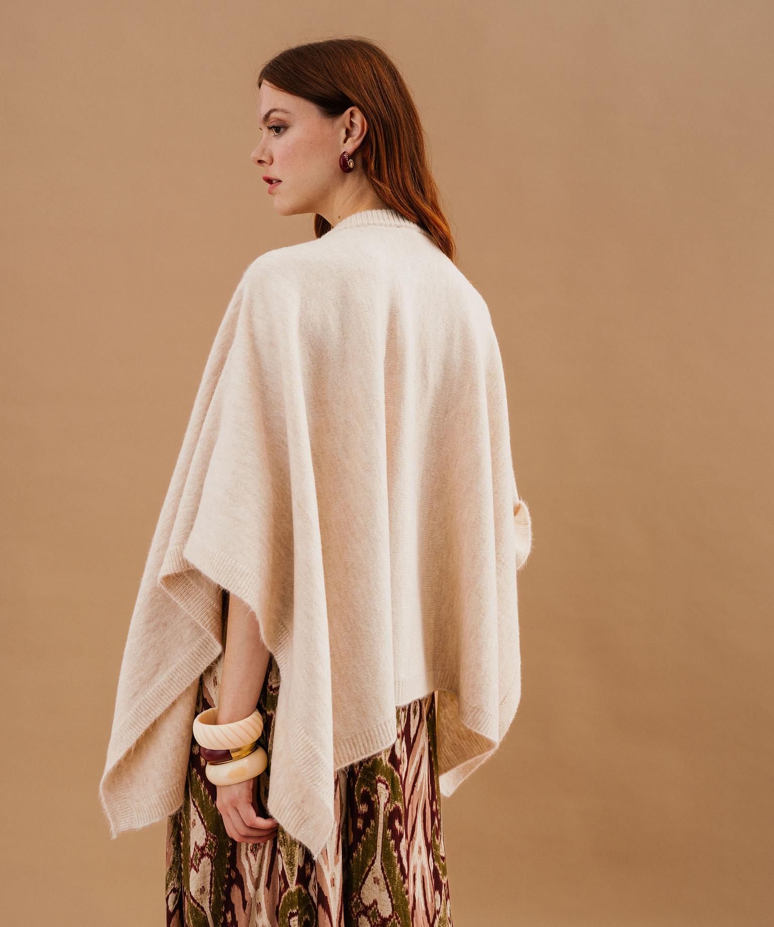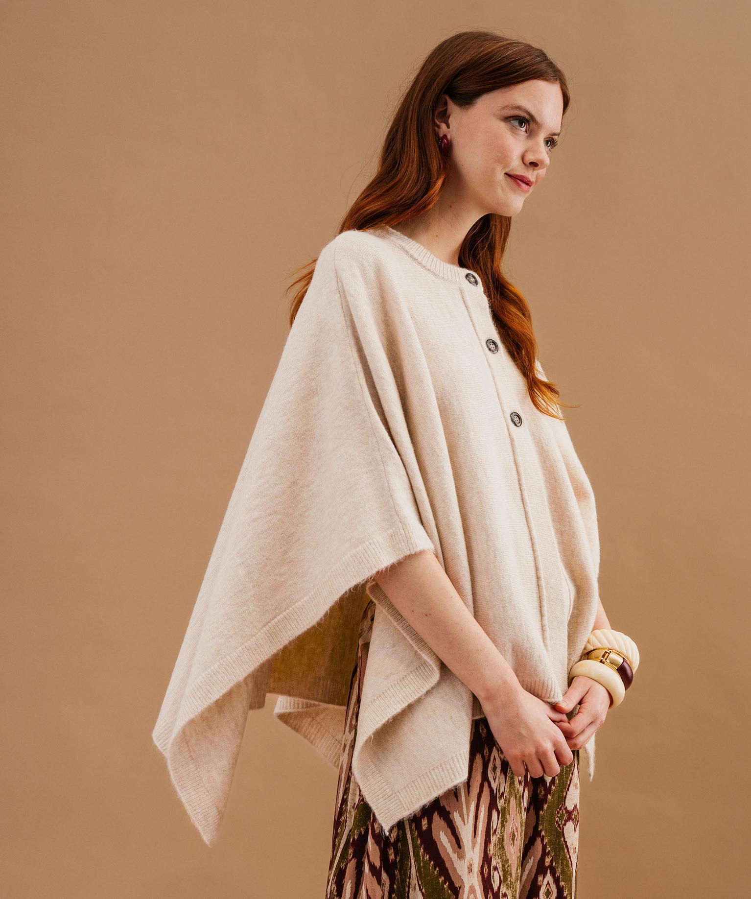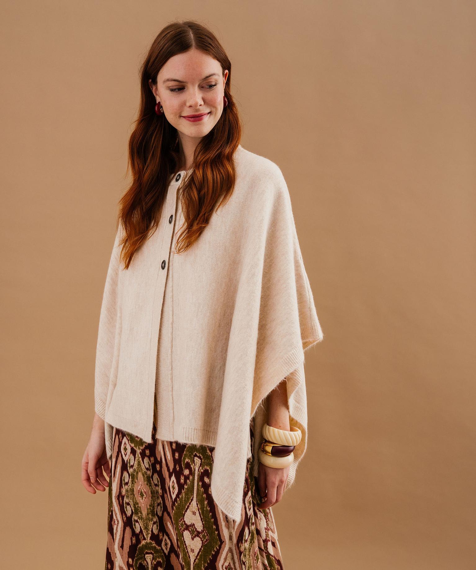 Craquez pour ce gilet femme esprit cape : une pièce enveloppante et chaleureuse. Sa maille douce et douillette procure un confort cocooning, parfait pour la mi-saison comme pour l’hiver. La coupe carrée, ample et souple, couvre largement les épaules et le buste pour un rendu bohème élégant. Le col rond côtelé et les finitions côtelées dans le bas apportent une jolie structure. Trois gros boutons devant confèrent au gilet une touche chic et originale. On l’imagine sur une robe longue imprimée ou un simple jean flare pour un look bohème raffiné.