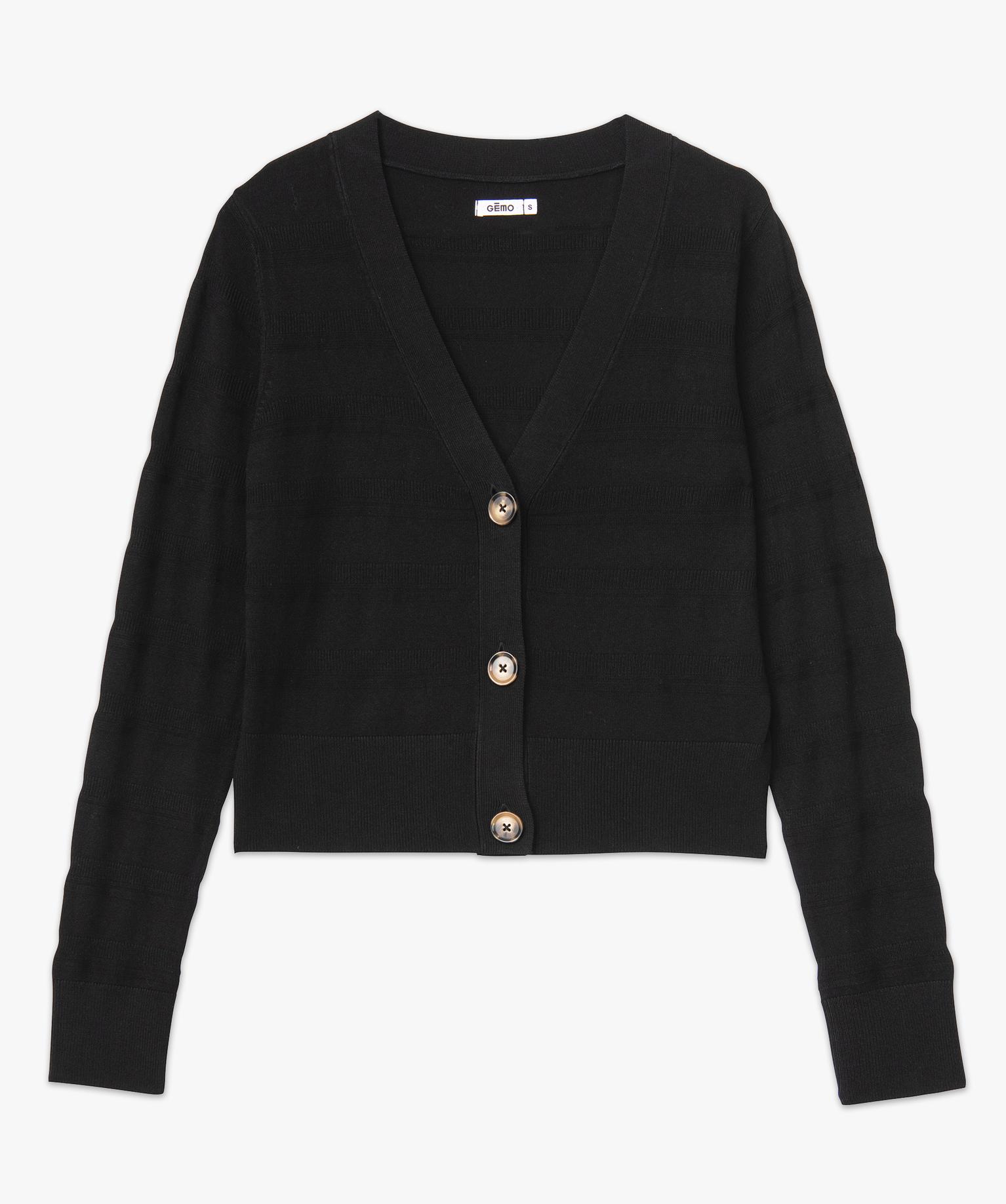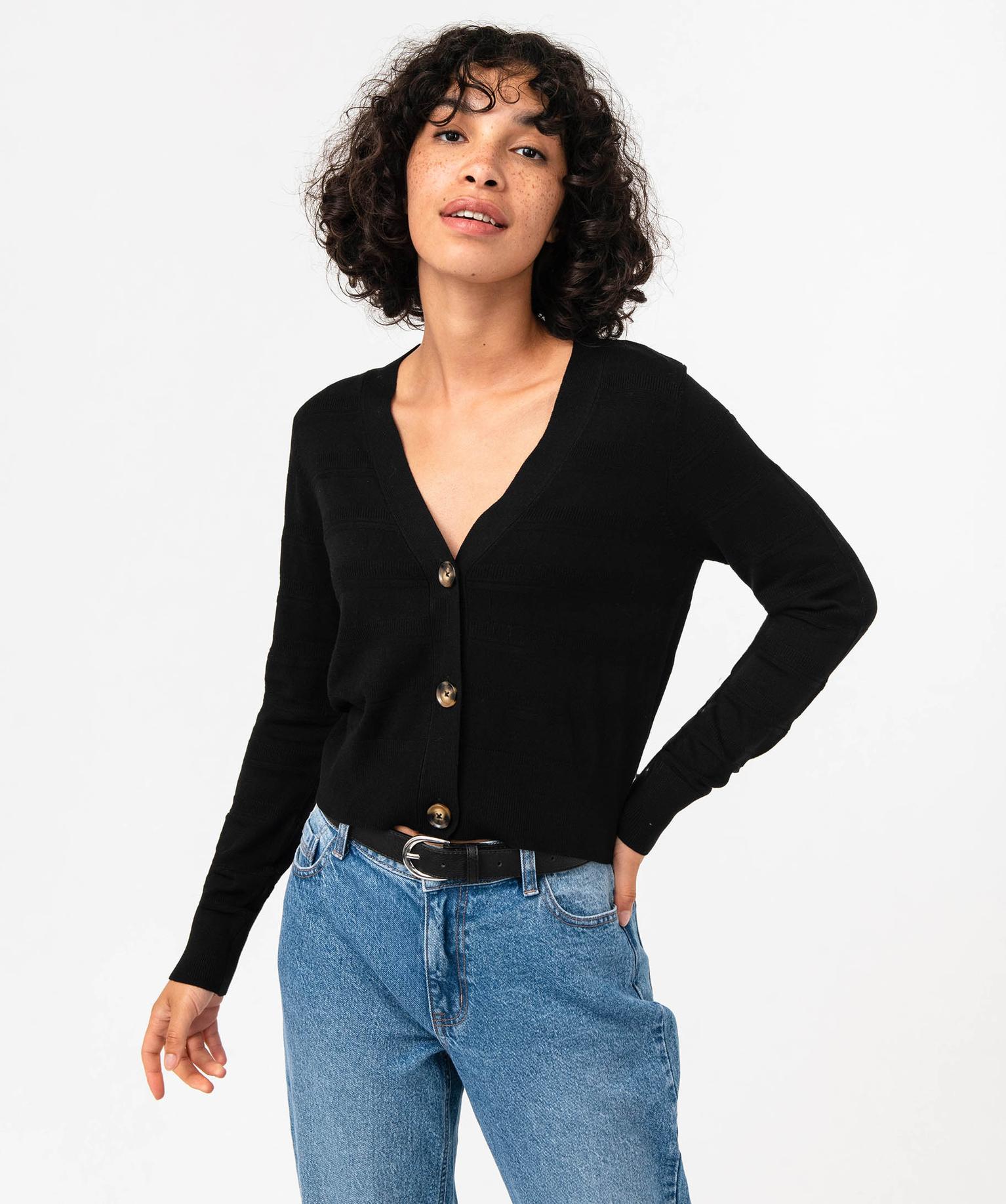 Indispensable pour donner du style à toutes vos tenues, le gilet court à col V. Un gilet en maille fine tricoté dans une alliance de différentes mailles formant de jolies rayures. Ce gilet femme accompagnera avec élégance une robe longue ou bien un pantalon taille haute et une chemise. Confectionné en viscose extensible, il offre beaucoup de confort. Il se ferme par trois gros boutons.