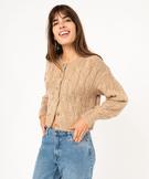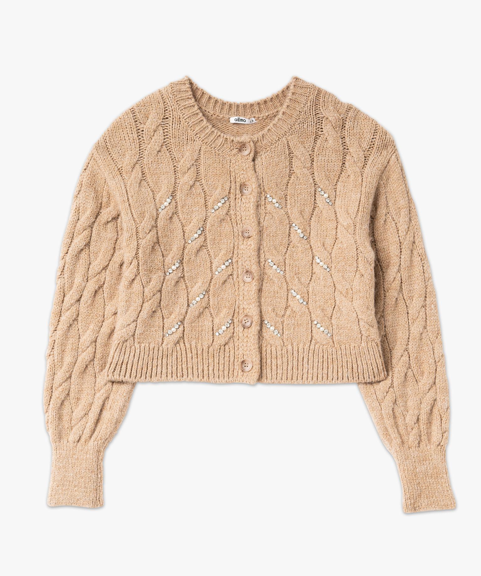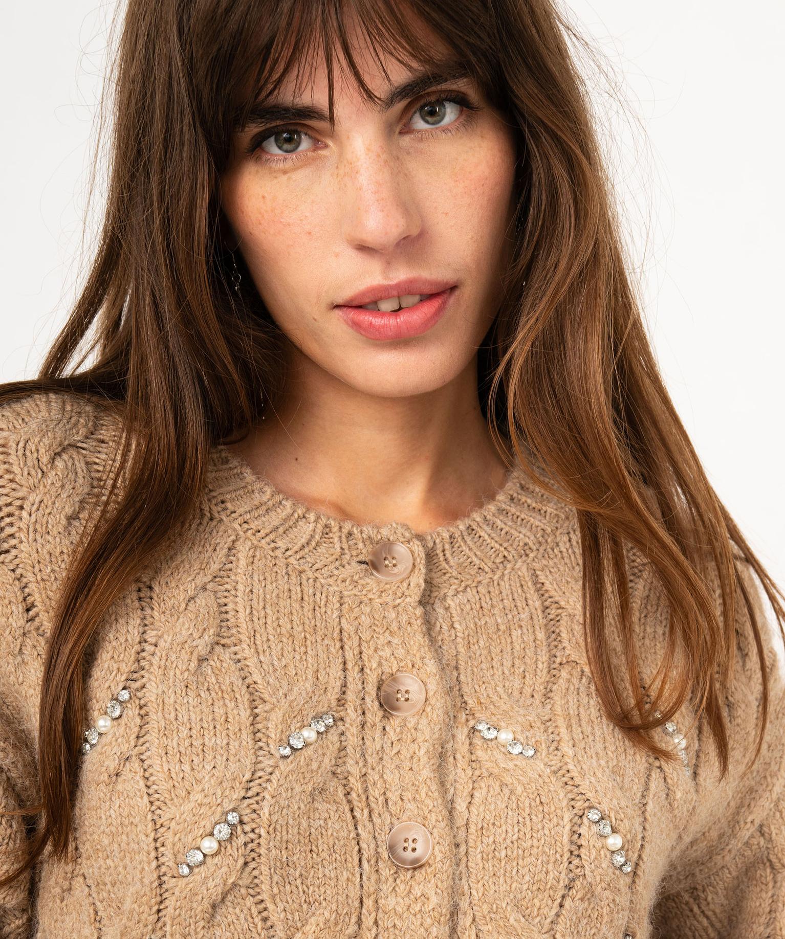 Gémo revisite le classique cardigan pour femme avec cette incroyable pièce très mode ! Le gilet est raccourci pour un effet crop top, doté de poignets resserrés pour un effet blousant très féminin et parsemé de strass et de perles sur l'avant pour une belle touche de lumière. Un gilet torsadé dans une couleur chic et indémodable, avec de gros boutons et un col rond. À porter fermé avec un jean wide leg taille haute et des boots à talon.