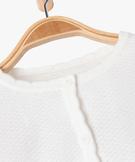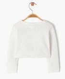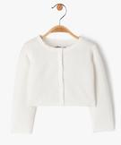 Sublimez les tenues estivales des petites filles avec ce joli gilet court tricoté dans une maille fantaisie 100% coton. Un cardigan bébé fille au look raffiné, agrémenté de finitions dentelées au col, aux poignets et dans le bas. Il possède un col rond et se ferme par une rangée de petits boutons délicatement pailletés. Ce gilet boléro sera sublime sur une robe de cérémonie !