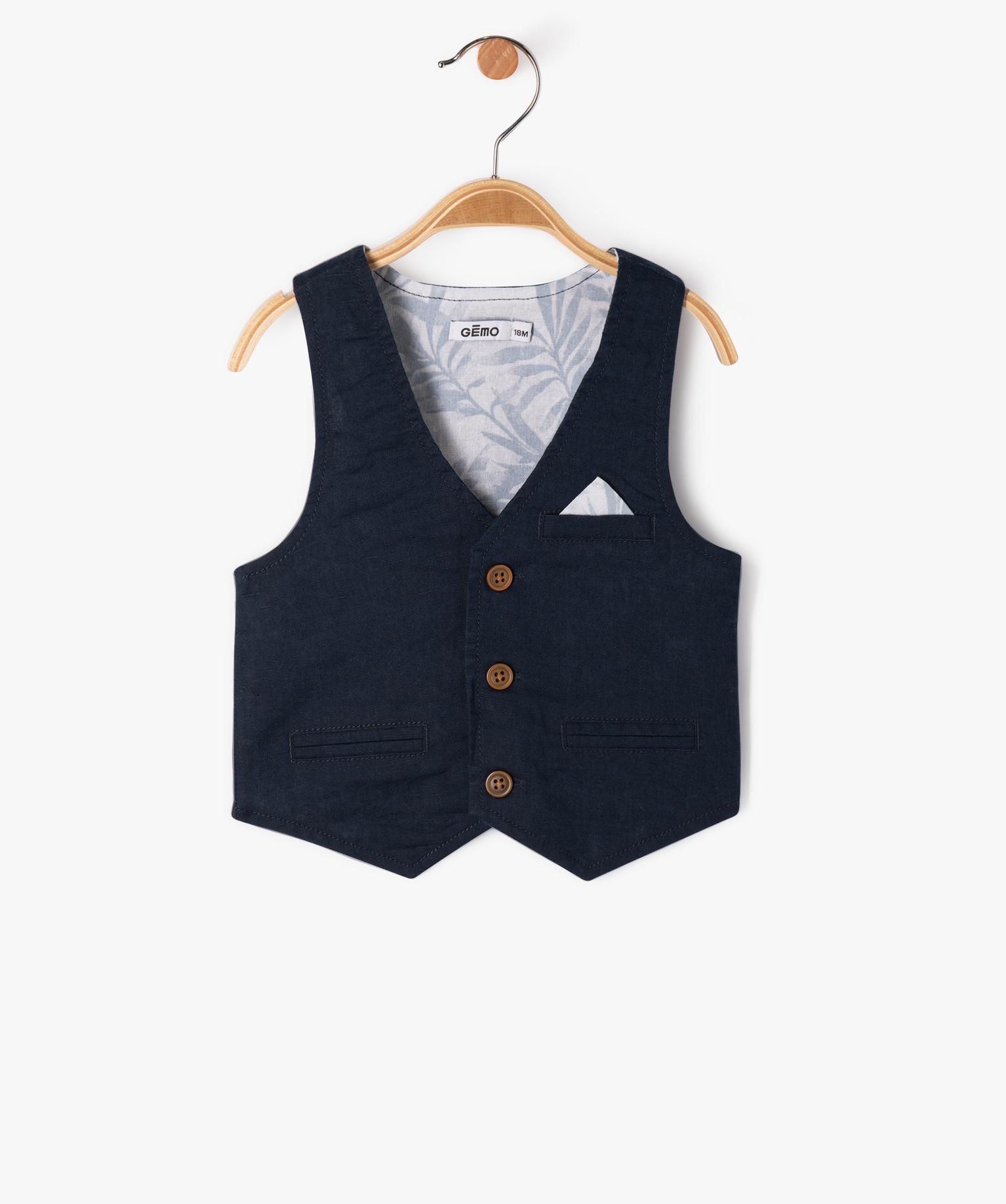 Allure ultra chic assurée pour les petits boys grâce à ce gilet sans manches. Une pièce élégante inspirée du véritable gilet de costume des hommes, idéale pour toutes les grandes occasions de l’été. Ce gilet bébé garçon s’affiche dans un coloris sobre et intemporel, twisté par une doublure à motif exotique. Il possède trois fausses poches dont une poche poitrine avec pochette assortie à la doublure. Confectionné en lin et coton, ce gilet bébé se porte sous un blazer lors des cérémonie ou bien seul, sur une chemise pour une garden party ! Fermeture trois boutons. Bas plus long sur l’avant.