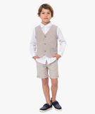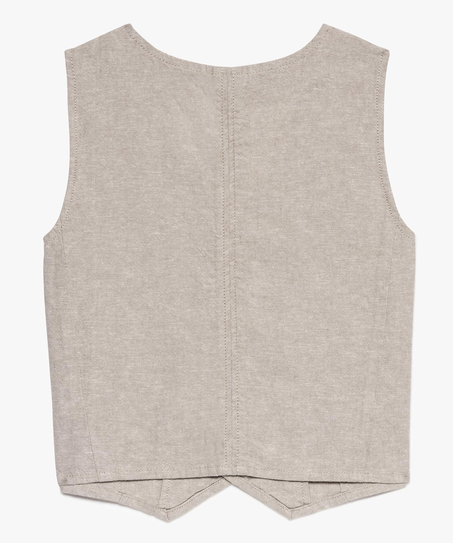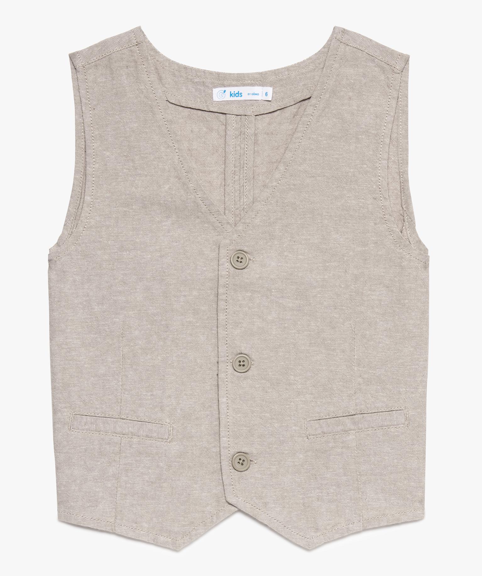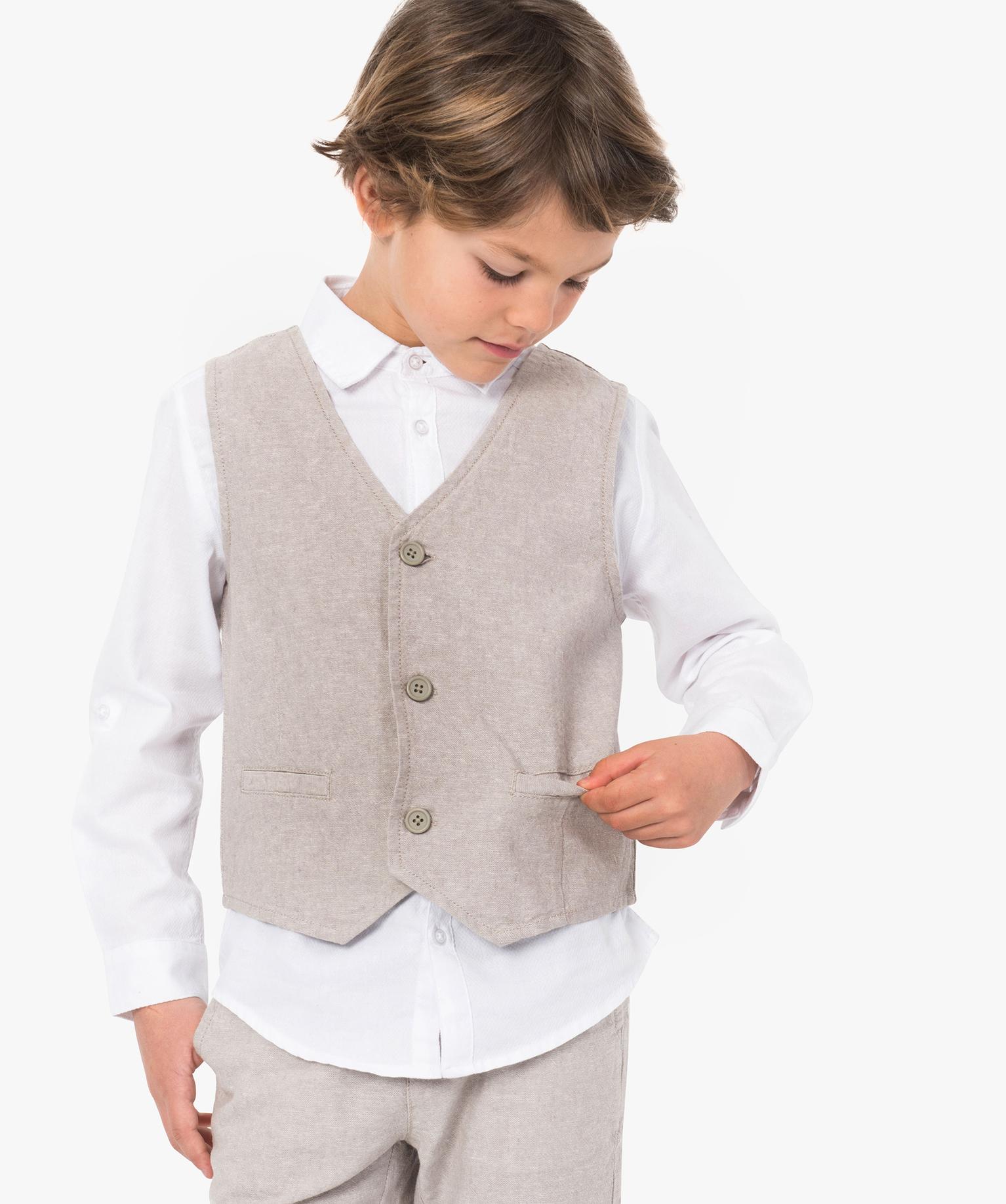 À porter par-dessus une chemise, chic, ou un tee-shirt, stylé, on adore le gilet sans manches pour garçon. Une pièce idéal pour habiller avec élégance votre enfant pour une fête, une cérémonie ou un événement particulier. Mélange de coton et de lin, ce gilet de costume est élégant, avec ce qu'il faut de naturel pour être facilement porté au quotidien. Non doublé, il est léger et confortable, même en plein été ! Ce joli gilet en lin possède deux fausses poches passepoilées devant et se ferme par 3 boutons ton sur ton.
