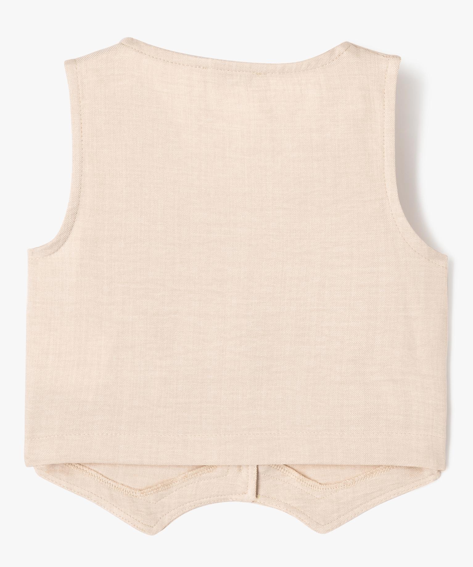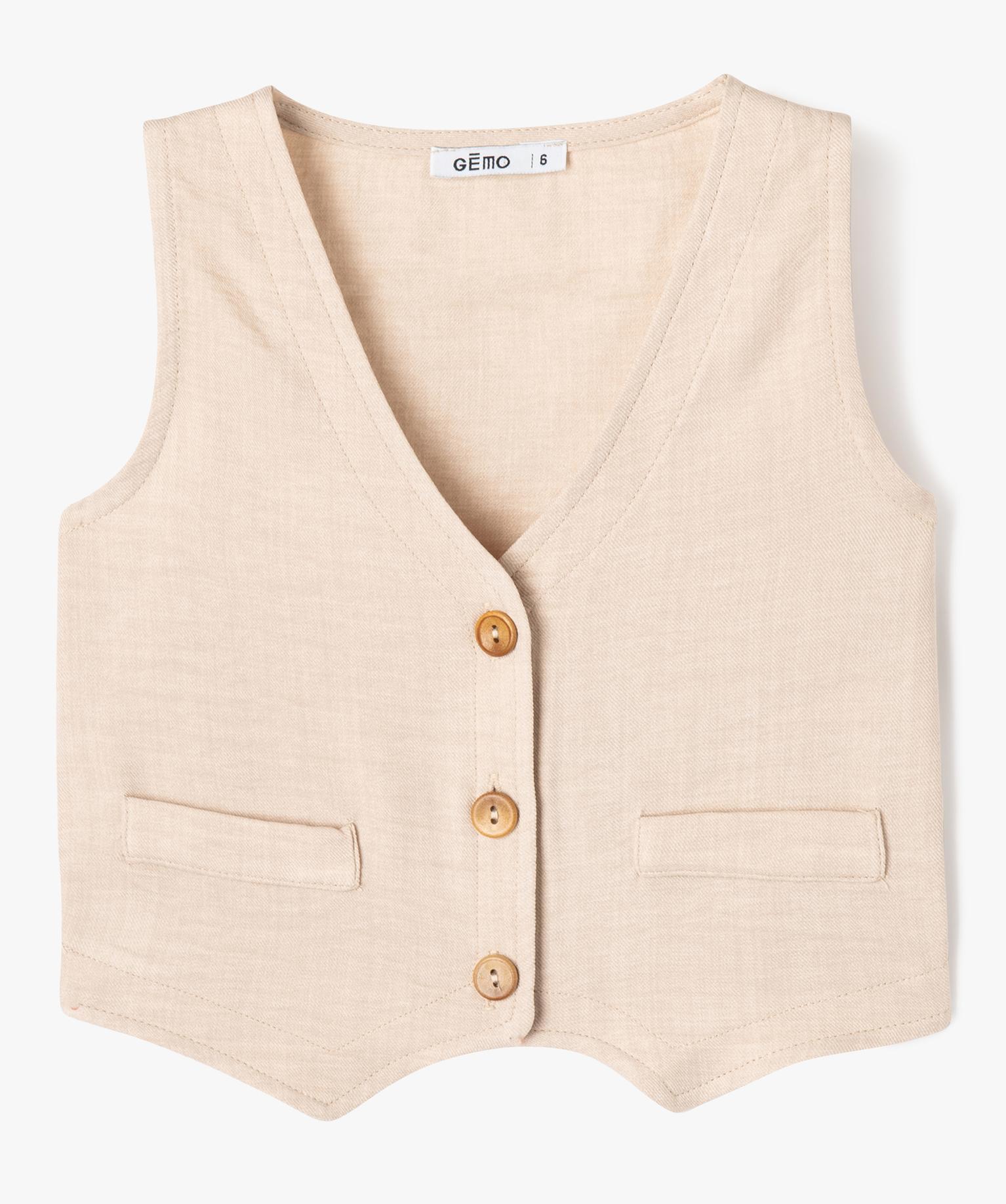 Pièce ultra chic du vestiaire, le gilet sans manches se décline dans une matière fluide et légère pour ajouter une touche de raffinement aux tenues des jeunes fashionistas. Ce gilet fille s’inspire du gilet de costume des hommes : coupe courte, finitions en pointe sur l’avant et fausses poches raglan. Il se ferme à l’aide de trois boutons aspect bois. Un gilet à porter sur une chemise, en association avec un pantalon en toile et des derbies pour une allure chic, ou sur un tee-shirt avec un jean pour un style légèrement décalé.