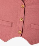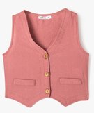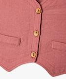 Le gilet sans manches se décline dans une matière subtilement froissée et dans un coloris girly pour le plus grand bonheur des jeunes fashionistas. Ce gilet fille emprunte la coupe traditionnelle du gilet de costume : coupe courte, finitions en pointe sur l’avant et fausses poches raglan. Il se ferme par trois boutons aspect bois. Un gilet à porter sur une chemise, en association avec un pantalon en toile et des derbies pour une allure chic.