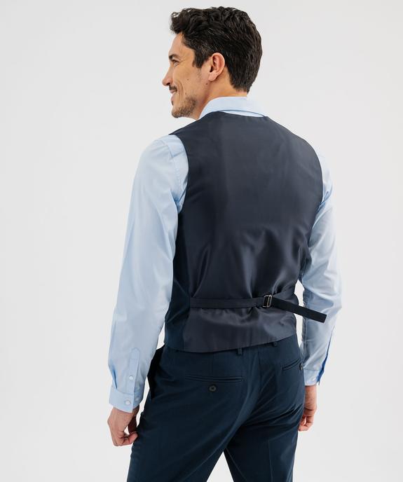 Le vêtement qui change tout : le gilet de costume pour homme ! Cette pièce accessoirise n'importe quelle chemise et upgrade facilement votre ensemble de costume blazer et pantalon. Ce modèle sobre et très élégant affiche une coupe près du corps contemporaine, avec pinces sur l'avant, et ajustable grâce à des brides et une boucle métallique au dos. Le gilet sans manches possède trois poches passepoilées sur l’avant, une fermeture 5 boutons, une découpe en pointe et un dos satiné. Uni et décliné dans des couleurs intemporelles, il est facile à intégrer à votre dressing.