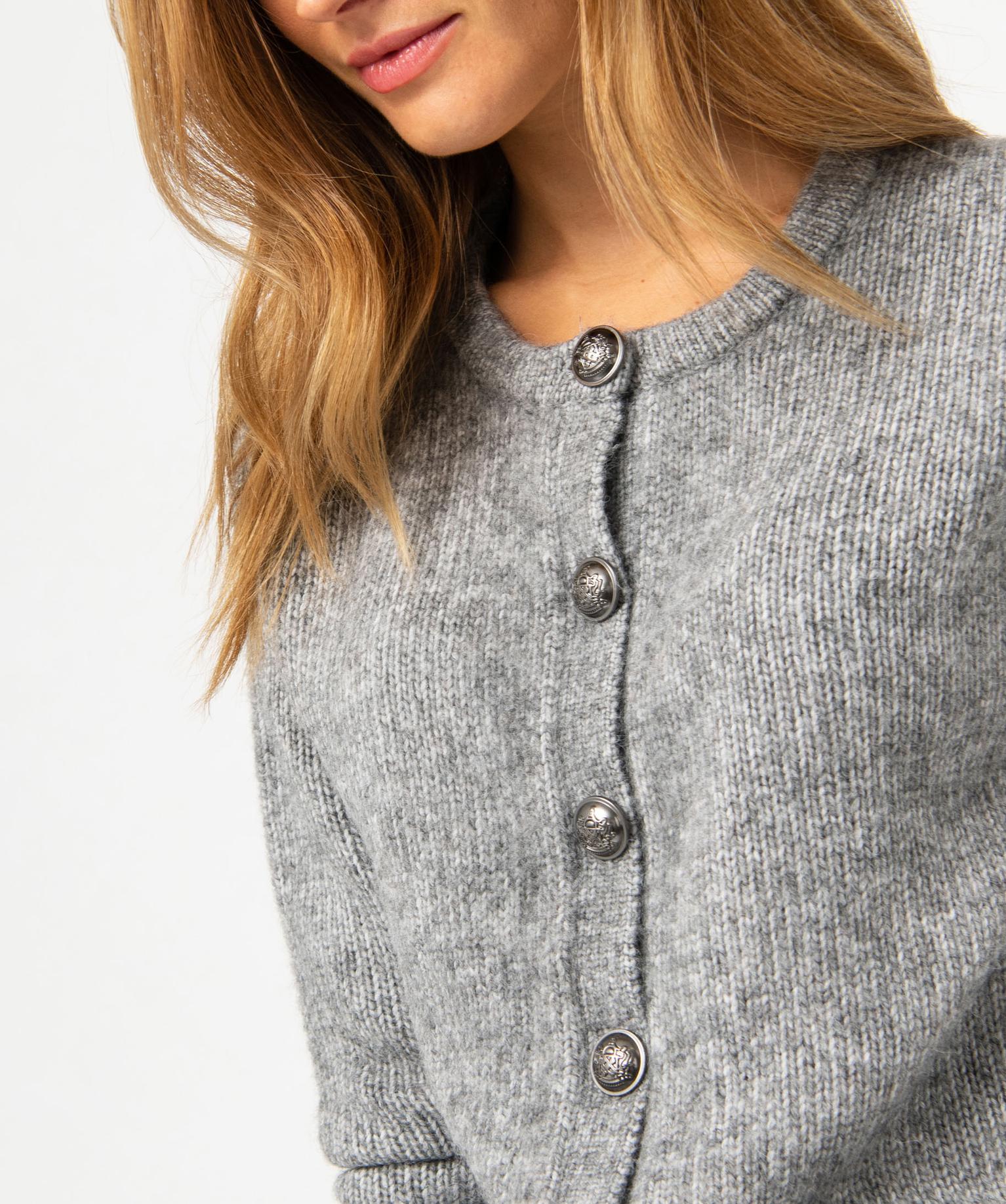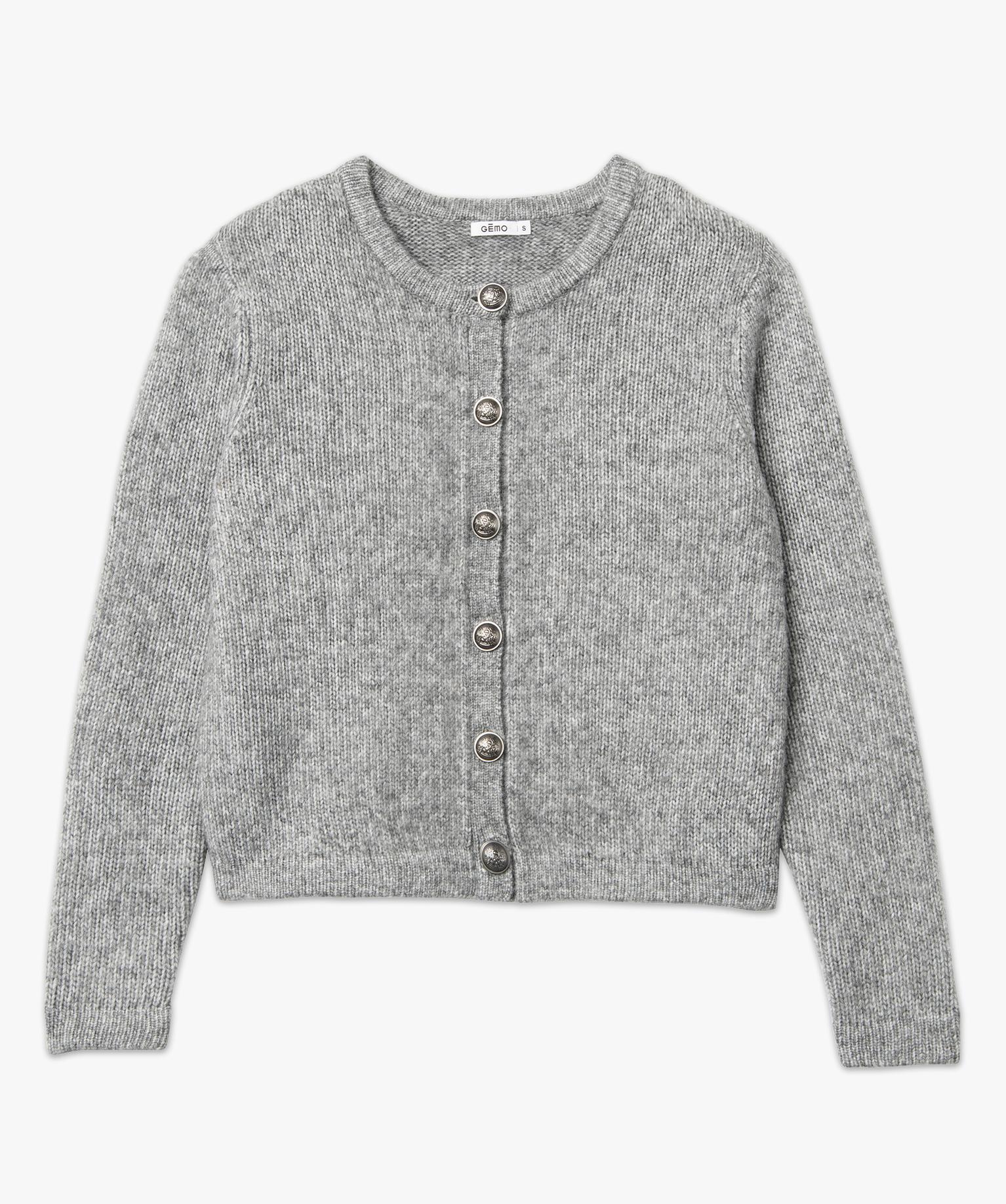 Le cardigan pour femme s'affiche ici dans un style sobre et raffiné avec sa coupe droite, son col rond ras de cou et ses gros boutons en métal gravés d'un blason. Une pièce à porter de manière classique chic avec un pantalon droit ou une jupe crayon. Ou à twister avec un jean skinny grunge et des bottes motardes ! Vous allez adorer sa maille douillette et chaude de ce gilet femme. Un basique indispensable dans tous les dressings ! Finition côtelée au col, aux poignets et dans le bas.