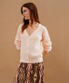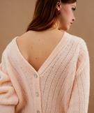 Un gilet femme à manches longues, à la fois délicat et romantique. Sa maille ajourée moelleuse apporte légèreté et douceur, tandis que ses jolis boutons nacrés soulignent son élégance. L’encolure V et les finitions côtelées raffinées structurent la silhouette. Le petit plus mode : le gilet a été conçu pour être portée avec la boutonnière devant ou au dos, avec un tombé toujours impeccable et un cou toujours mis en valeur. Décliné dans un coloris pastel tendre, le gilet se marie parfaitement à un denim clair ou une jupe plissée.