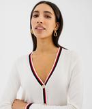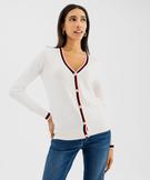 Ce cardigan classique se distingue par sa maille fine et souple majoritairement composée de viscose. Pour une touche de raffinement très traditionnelle, le gilet femme à col V se ferme par de gros boutons dorés et gravés et sa finition bord-côte est rehaussée de bandes colorées. L'encolure en V souligne joliment le décolleté. Cassez les codes de la mode et portez ce cardigan avec un jean baggy et des baskets !
