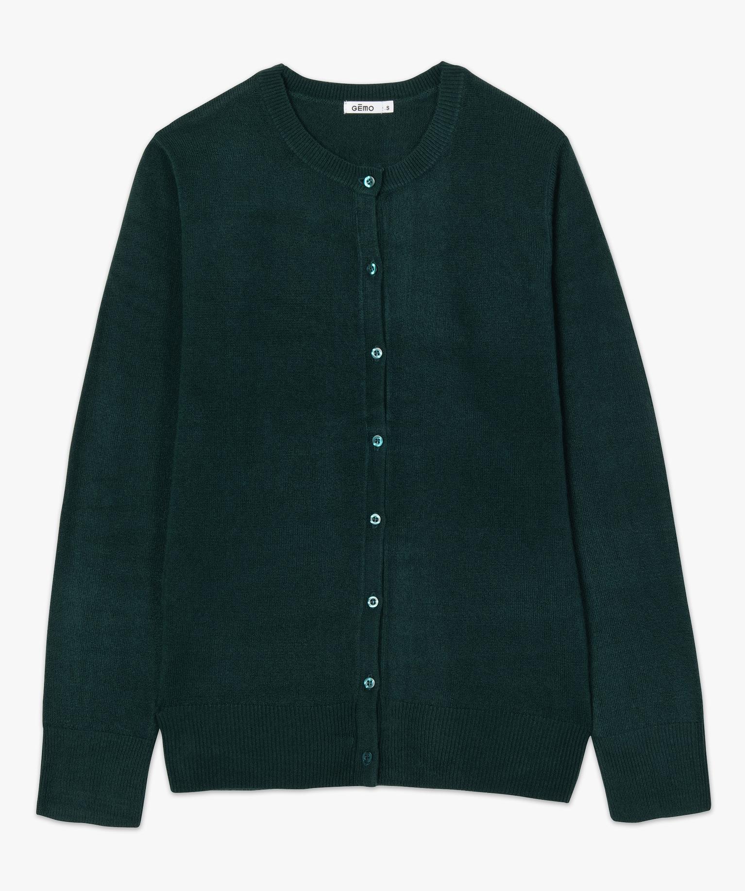 Gilet femme boutonné coupe classique et col rond vert fonce