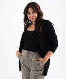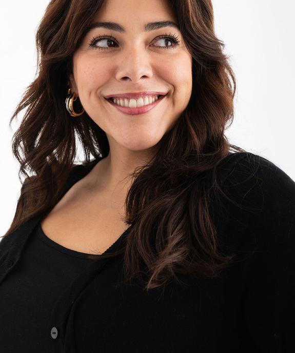 Le gilet à col rond fait partie des pièces indispensable du dressing féminin, s’accordant facilement avec tous les looks. Ce gilet pour femme grande taille (du 46/48 au 54/56) séduit par sa matière viscose légère, douce et extensible. Il affiche une coupe longue, possède des jolies finitions bord-côte légèrement resserrées aux poignets et dans le bas, et se ferme par une rangée de boutons ton sur ton. Un essentiel à porter sur une chemise à grand col ou seul comme un pull avec un pantalon en toile et des derbies.