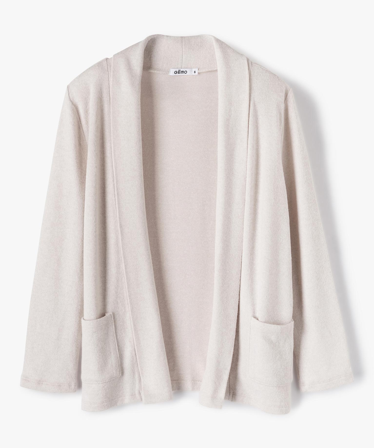 Un gilet fin et fluide, sans bouton pour un porté ouvert façon veste. Le gilet pour fille se pare d'un élégant col châle et de deux poches plaquées sur l'avant. Décliné dans des coloris faciles à marier, il réchauffera volontiers une robe à fleurs ou un ensemble jean et pull. Un gilet col châle à porter toute l'année !