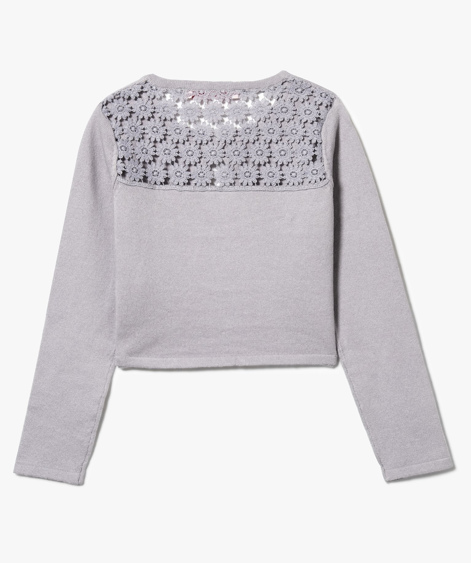 Quel charme ce gilet pour fille. Sa forme boléro sera parfaite sur une chemise, un tee-shirt ou sur une robe. Son dos en dentelle apportera une touche romantique toutes les tenues. Il se ferme par un petit bouton sur l'avant. Ce petit gilet s'accordera parfaitement avec une robe de cérémonie. Disponible en plusieurs coloris.