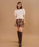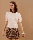 Un gilet femme à manches courtes, délicieusement romantique. Sa maille ajourée se mêle à de superbes empiècements en dentelle fleurie pour un résultat raffiné et féminin. La boutonnière capte la lumière et les épaules froncées offrent un effet blousant plein de charme. La coupe droite, qui tombe pile au-dessus des hanches, équilibre la silhouette. Au dos, une maille jersey classique assure confort et simplicité. Un gilet parfait pour sublimer un pantalon taille haute ou une jupe fluide.
