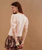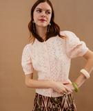 Gilet manches courtes en maille ajourée et dentelle femme rose