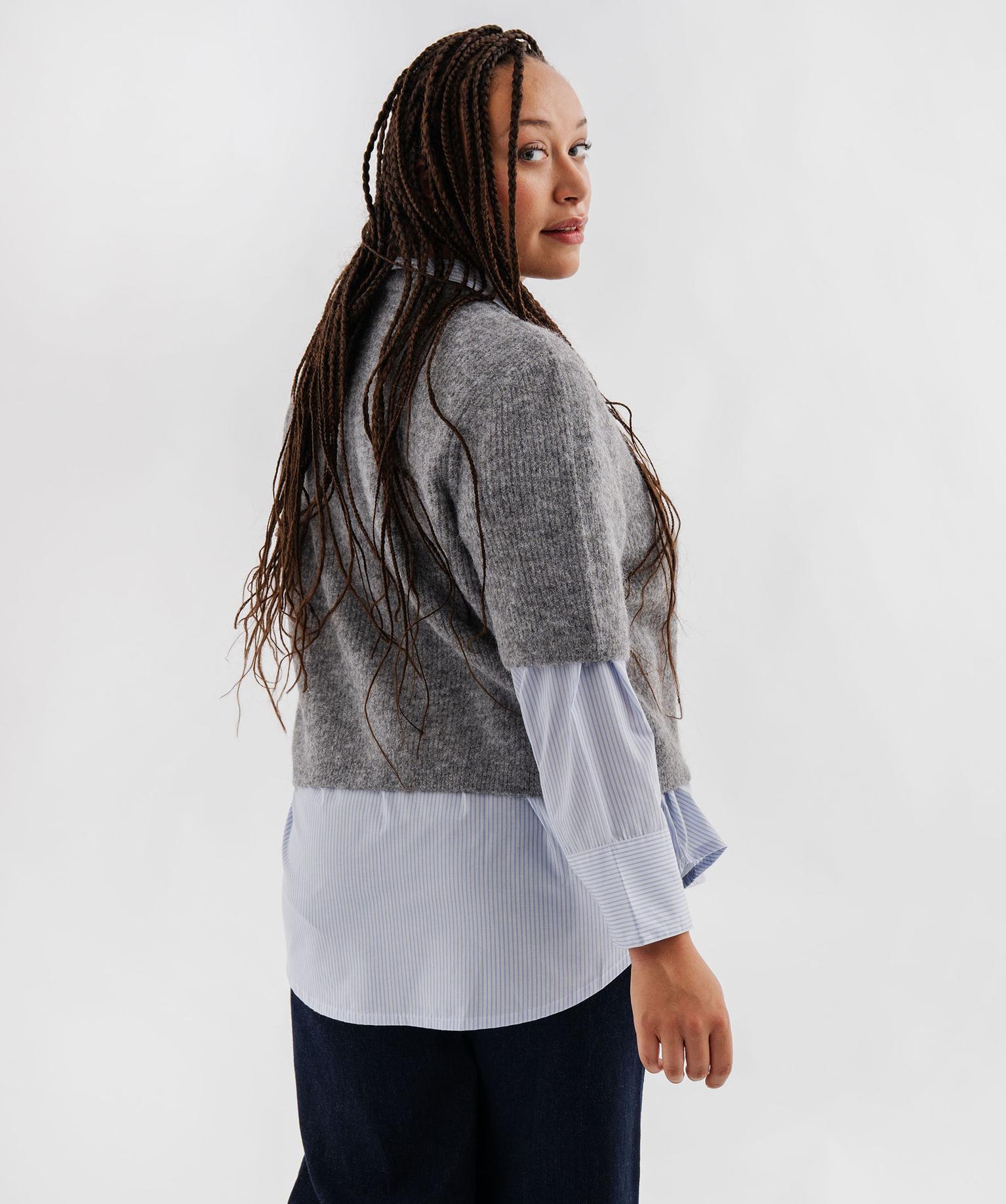 Ce cardigan revisite les grands classiques avec originalité : ses manches courtes au niveau du coude lui donnent un style singulier et beaucoup de personnalité. Sa coupe droite en fait une pièce idéale à associer à une blouse ample ou une chemise, pour un look à la fois décontracté et travaillé. Les boutons nacrés ajoutent une touche raffinée à vos tenues. Vous serez également séduite par sa maille chinée, douce et douillette. Elle contient 5 % de laine et une pointe d’élasthanne pour encore plus de confort ! Un gilet femme grande taille (du 46/48 au 54/56) facile à vivre, chaleureux et moderne.