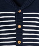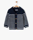 Une brise marine souffle sur le vestiaire de bébé grâce à ce joli gilet rayé ! Un gilet bébé garçon confectionné en coton, doté d’un large col en bord-côte et fermé par des boutons aspect bois pour une touche d’authenticité supplémentaire. Ce cardigan marin réchauffera de nombreuses tenues estivales et reste parfaitement adapté jusqu’à l’intersaison. Finition bord-côte aux poignets et dans le bas.