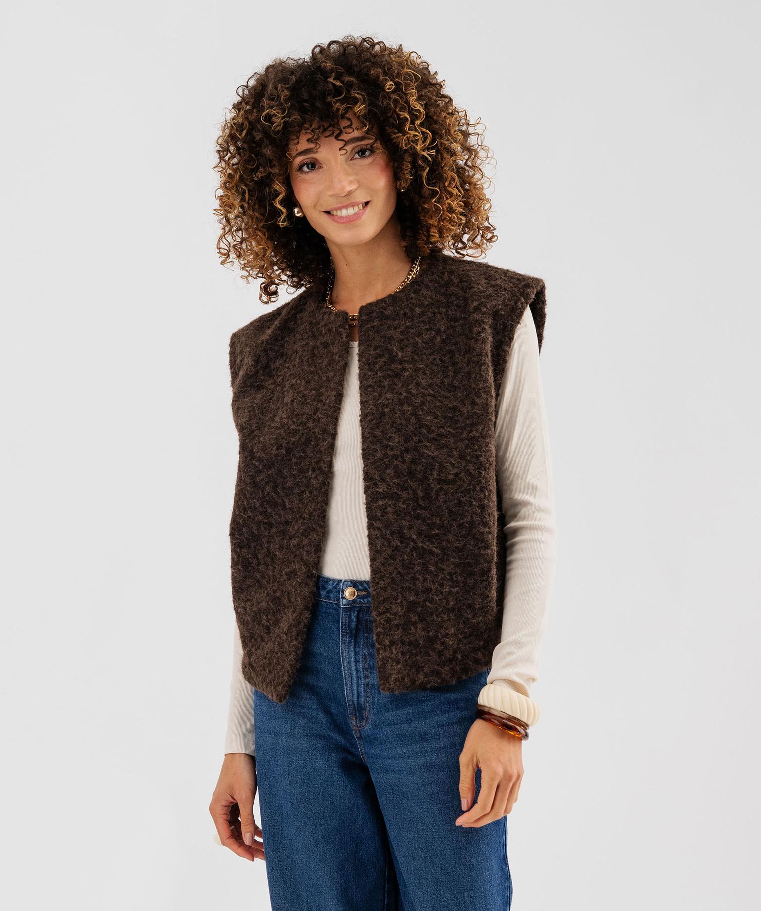 Ce gilet sans manches est la pièce idéale pour réchauffer toutes les tenues tout en y insufflant une touche tendance. Ce gilet pour femme séduit par sa maille duveteuse réconfortante et sa coupe oversize avec plis sur l’avant et ses larges emmanchures qui permettent une superposition facile. Un gilet oversize facile à enfiler sur une chemise, un tee-shirt ou un pull. Il se porte ouvert pour un look décontracté, mais peut également se fermer à l’aide d’une broche pour une allure plus chic. Deux poches latérales dissimulées dans les coutures.