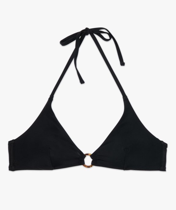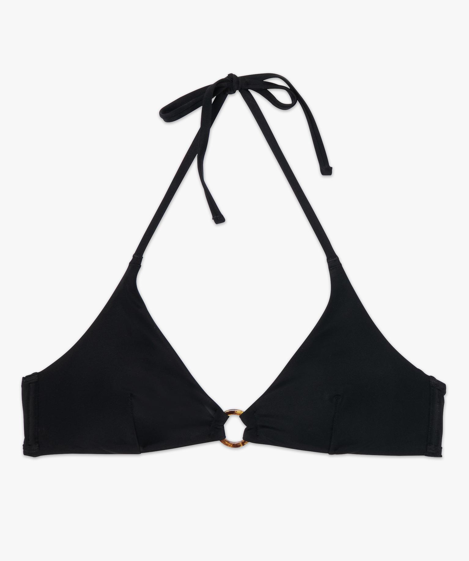 Un haut maillot de bain femme qui brille par sa simplicité et son look au top de la tendance. Ce soutien-gorge de bain triangle est twisté par un anneau en résine à l’entrebonnet qui apporte une discrète touche d’originalité. Il possède des coussinets amovibles et se noue facilement dans le dos et autour du cou. Ce haut de maillot de bain se porte avec le bas assorti.