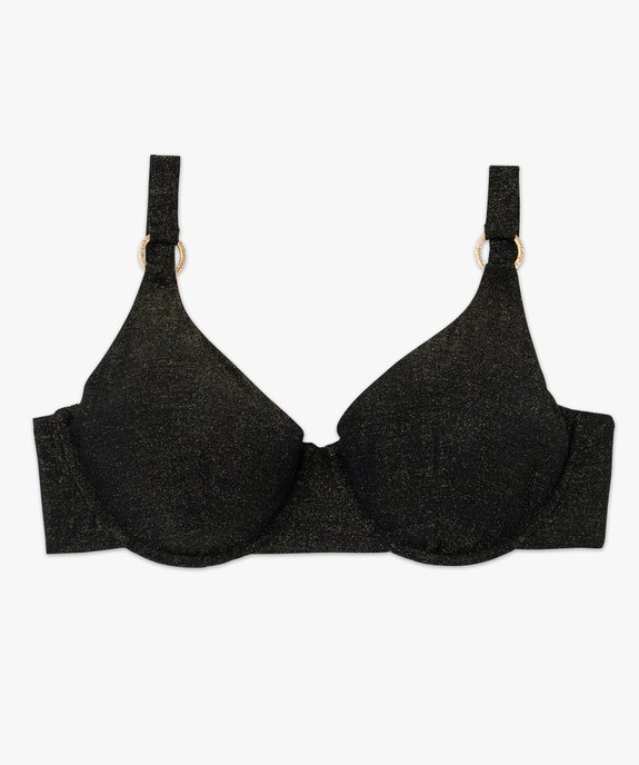 Haut de maillot de bain femme grande taille (du 100D au 115F) à armatures, avec bonnets emboitants et larges bretelles ajustables pour un maintien optimal et un joli galbe naturel. Vous serez sous le charme de son rendu pailleté doré féminin et élégant. Le soutien-gorge de bain est orné d'anneaux en métal doré sur le devant des épaules, comme 2 petits bijoux. Fermeture par clip au dos. À porter avec la culotte de bain assortie pour un total look glamour.